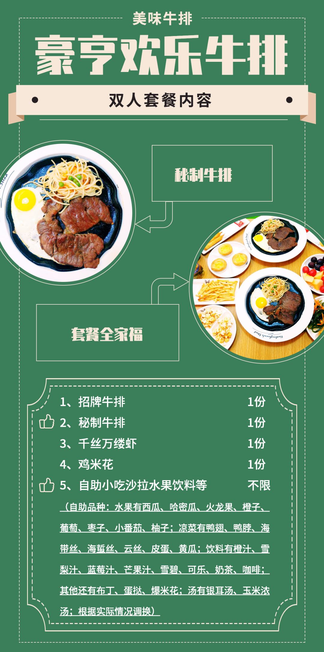 ▲招牌牛排、秘制牛排、千丝万缕虾、鸡米花、自助小吃沙拉水果饮料等...