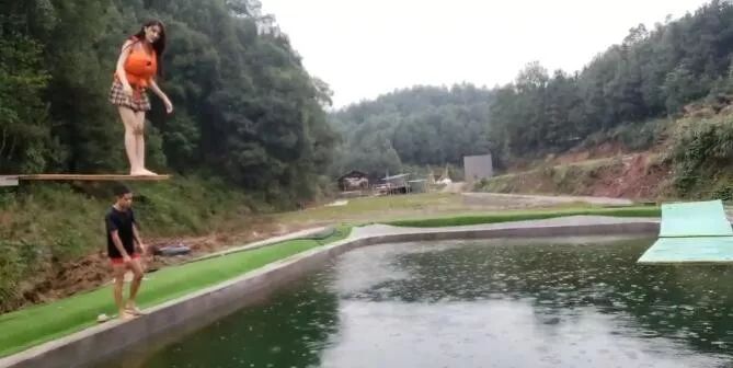 虽说这个动作还是有难度的,还是为了奖励,我们的女主播听到后还是欣然接受,立马重新站在跳板上,表演了一波跳水。