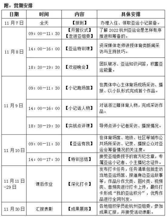 此外,成功入围“亚运小记者小主播”的将接到主办方短信通知。营期正式开始前,主办方将组建相关微信群用于活动期间的通知事宜。