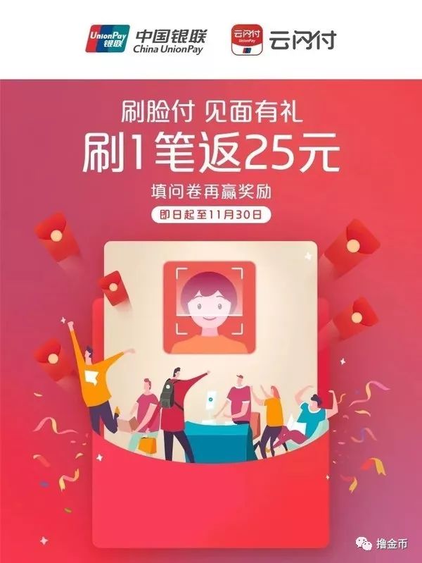 即日起至2019年11月30日,用户通过云闪付APP注册开通“刷脸付”,并在指定地区的活动商户门店使用“刷脸付”消费满10元,即可在支付成功后的1 - 3个工作日收到25元云闪付红包奖励,每人每月限享1次。