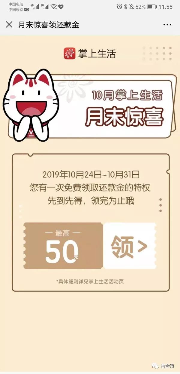 2019年10月24日-31日,用户通过直达链接进入招商银行掌上生活APP,可直接领取最高50元还款金。