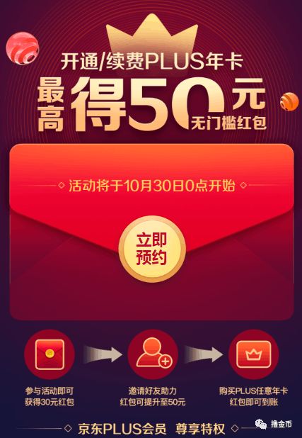 京东开通/续费plus年卡可得 最高50元无门槛红包 最低得30元无门槛红包