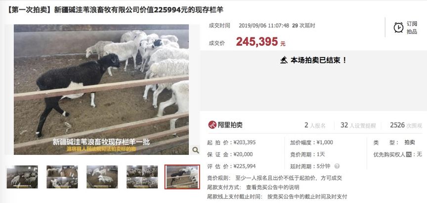 2019年9月5日上午10时,新疆某畜牧有限公司994只羊上架阿里拍卖。涵盖了怀孕母羊、种公羊、两个月以上断奶羔羊,还有山羊等各种羊。最终,在经历了30次出价后,这批羊被以24万余元的价格拍走。