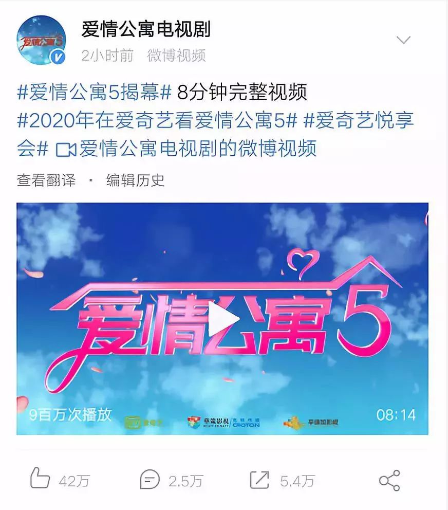 就在前几个月,《爱情公寓5》的官方预告片正式在微博放出之后,其热度也是不断攀升登上热搜榜。第五季的预告片在2小时内收获了42万点赞,5.4万次转发。