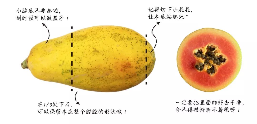 把木瓜清洗干净,按照3:1的比例横向剖开,接着将底部的根蒂部分切下一片,目的是让木瓜能够站稳脚跟。用勺子掏出里面的籽,一定要掏干净,如果觉得看着不爽可以让别人代劳,比如X先生就很适合。