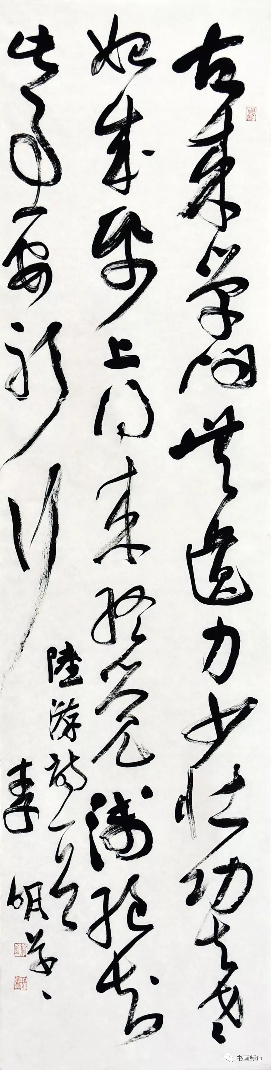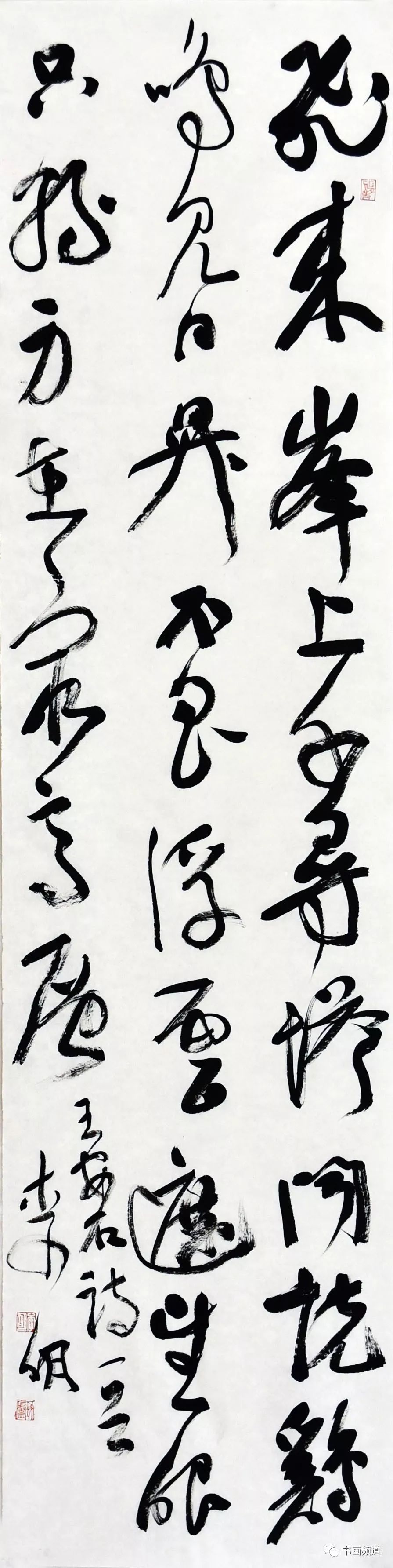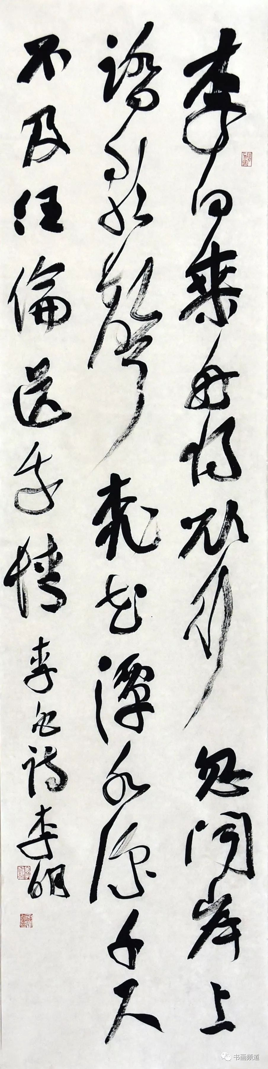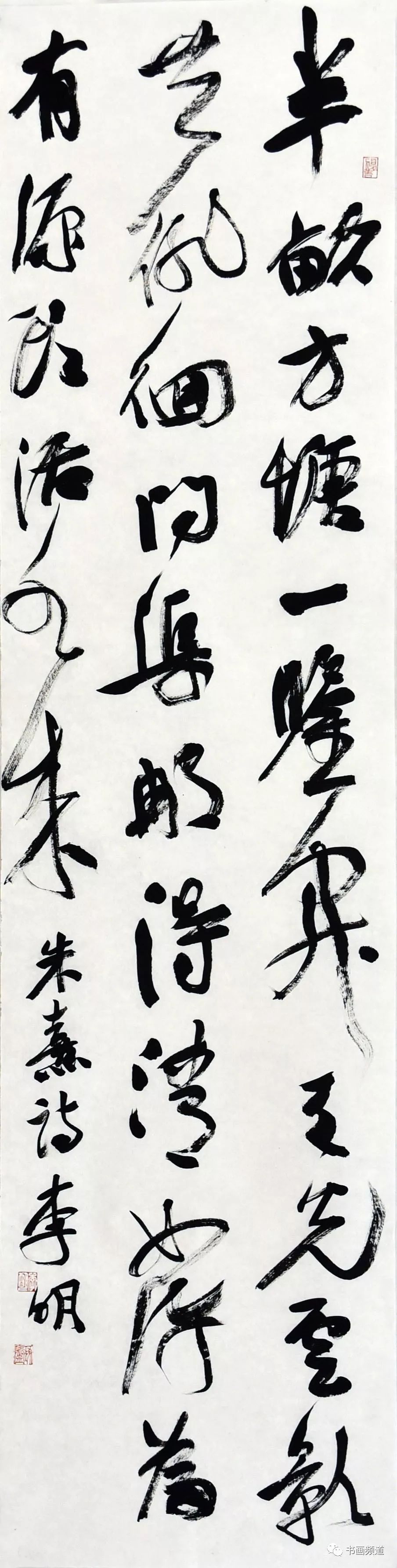 在作品中呈现出理智与情感的“工雅仪态、丝丝入扣”又不着痕迹,足证其天资异秉,本心纯良自在,见素抱朴而莫能与之争美。由此,随着作品体量的增长,其精神内核之裂变也便借以完美法则应心而呈伞状延伸。气息能量以超强波浪状绵绵扩散,旋入太极。故而个体之点线面,全局之阵法,细节之玄机都以各自的重心而交相呼应错落有致,偶现纠结又顺情顺势得以解破,浑然一体,纲常有序。所以李明的书法创作超越了时空局限,牵一发而全身动,态势永至鲜活。豪放真率的情性被敷以“文雅”的“包浆”。
