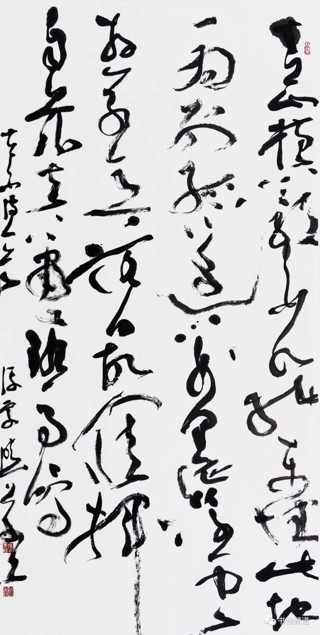张春晓在书法的主攻方向为草书。“古”“厚”“雄”“逸”的草书形成个人风格,字的点画要有力量感,这种力量在纵横之间的挣扎中得以体现,竖要纵逸中有横向的张力,横要宽博中有纵向的张力。这种笔法甚难,重在使气,气到方能力到,是书者自信力、意志力、控制力的综合体现。字的图式及章法构成也是如此,通过不同的方法组合、关系对比找到一种相对理想的表现方式,进而表情达意,写我精神。