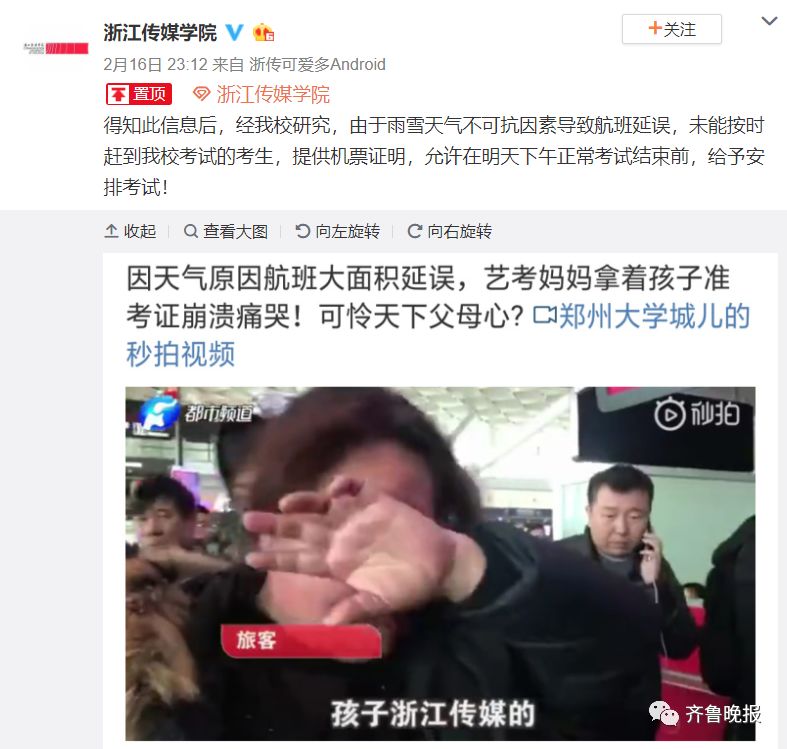 得知此信息后,经我校研究,由于雨雪天气不可抗因素导致航班延误,未能按时赶到我校考试的考生,提供机票证明,允许在明天下午正常考试结束前,给予安排考试!