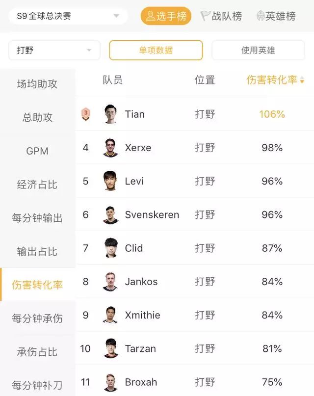 Tian绝对是本届世界赛令全世界都留下深刻印象的打野了。无论是FPX赢下还是输掉的局,Tian的表现都无可挑剔。他的盲僧、酒桶、蜘蛛和奇亚娜,每一只都是足以让对面送上ban位的英雄,在前期节奏带动方面,Tian当之无愧的是本次世界赛的第一人。