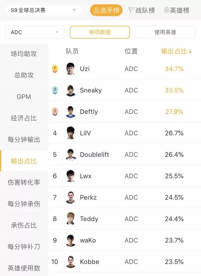 RNG就是最好的例子,中路Xiaohu的输出占比为20%排名第14,下路Uzi的输出占比为34.7%排名第一,最后惨淡出局。所以在八强赛中,Doinb一定要拿出能够Carry的英雄,展现自己的实力,帮队伍拿到四强的门票,而不是选择坦克中单,把宝都压在Lwx的身上。