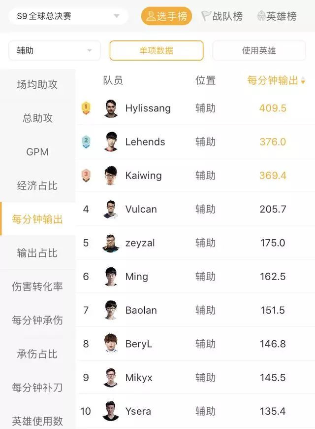 在本次小组赛中,Hylissang除了和Rekkles两把盖伦猫咪以外,还选用了2场日女,1场机器人和1场派克,都是找机会能力和进攻型极强的辅助,而两场猫咪的高额输出也让他以409的分均输出荣登辅助输出榜单第一位,场均助攻也以仅次于Lehends的9.8排名第二。他15.6%的经济占比也是辅助中最高的,说明FNC在会为他投注一定的资源。
