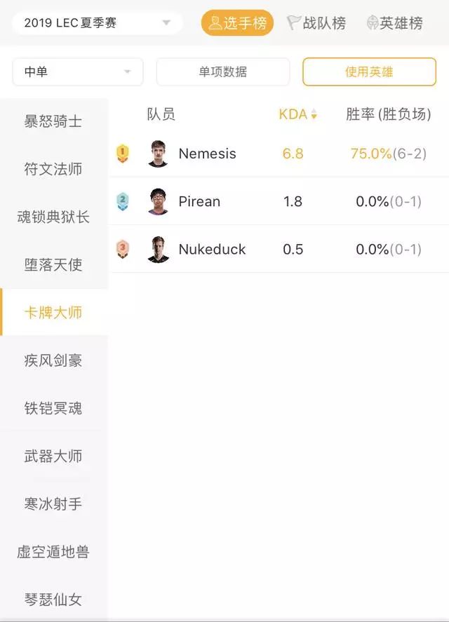而Nemesis则跟Doinb有着一些相似之处。他们都是支援见长的中单,在线上不会给到太大的对线压力,但是会在支援方面给边路压力。Nemesis也是AD卡牌的创始人,对阵FNC的所有队伍都几乎会封锁他的这手AD卡牌,因为他的卡牌是FNC全球流战术的发动机,卡牌也是他在LEC夏季赛使用最多的英雄。
