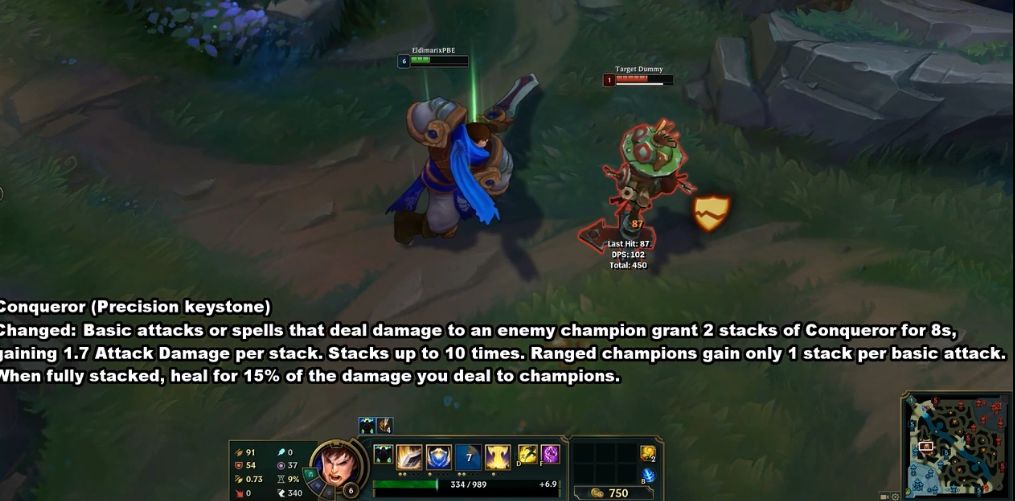 征服者符文调整,新的征服者变得更强,近战英雄普攻和技能获得2层征服者效果,持续8秒,每层7点攻击伤害,最多叠加10层,远程英雄每次基本攻击只能获得1层,当征服者效果叠满,治疗你对目标造成的伤害的15%。官方演示中,远程英雄释放技能是出现获得2层征服者效果,这个机制还有待考究,如果远程英雄可以用技能叠加征服者,EZ没了偷钱或许有新的出路。