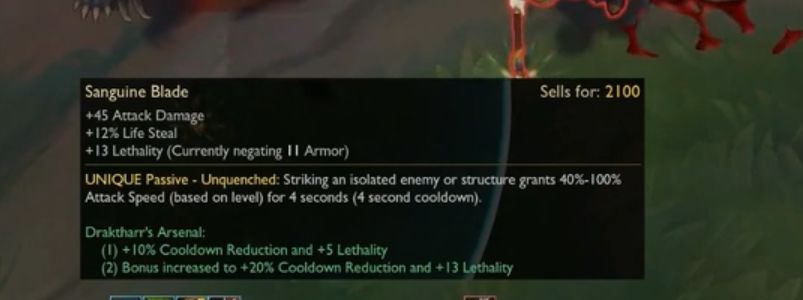 新增装备血刃增加45点伤害增加12%生命偷取增加13点护甲穿透独特被动:不熄火攻击一个孤立的敌人或建筑可以获得40%-100%的攻击速度(基于等级),持续4秒。4秒的卡拉塔尔的兵工厂:(1)+10%冷却减少,+5点伤害(2)奖励增加到冷却时间减少20%和13点杀伤力暂时英文翻译就是这样,哪里不懂得的可以等中文版出来,不过这个装备增加攻速是真的,售价2100,亚索又可以快乐了!