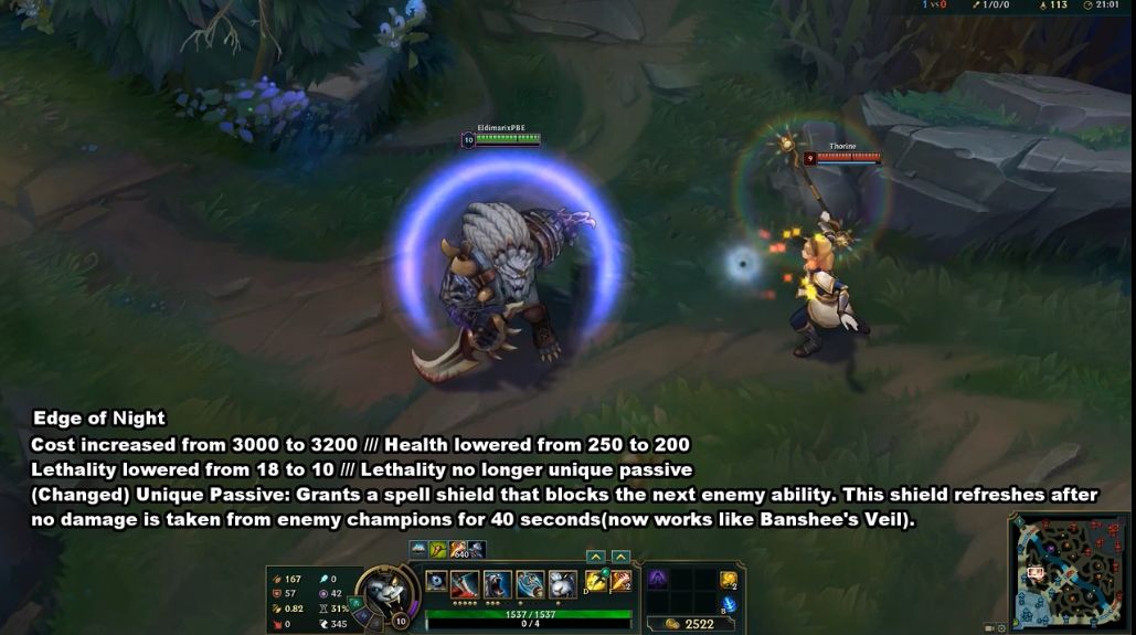 夜之锋刃调整,费用从3000增加到3200,生命值从250降低到200,穿甲从18降低到10,攻击力不再是唯一被动,现在可以像女妖面纱一样工作,提供一个法术护盾,不需要进行引导。
