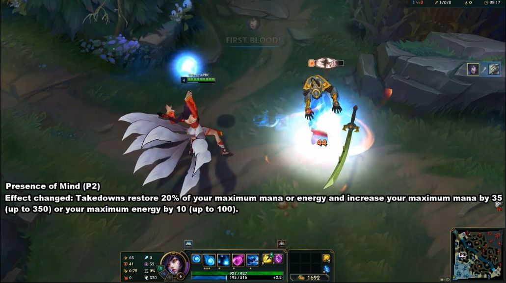 气定神闲符文调整,新的气定神闲符文撤销原返还终极技能冷却时间效果,改为击杀目标增加英雄最大法力值35(最多350)或你的最大能量10(高达100),参与击杀回复法力值的效果不变。气定神闲调整后能够恢复能量值,增加能量上限。这对于阿卡丽、劫这类英雄来说无疑是好的,恐怕官方后续还是要再对阿卡丽动手啊!