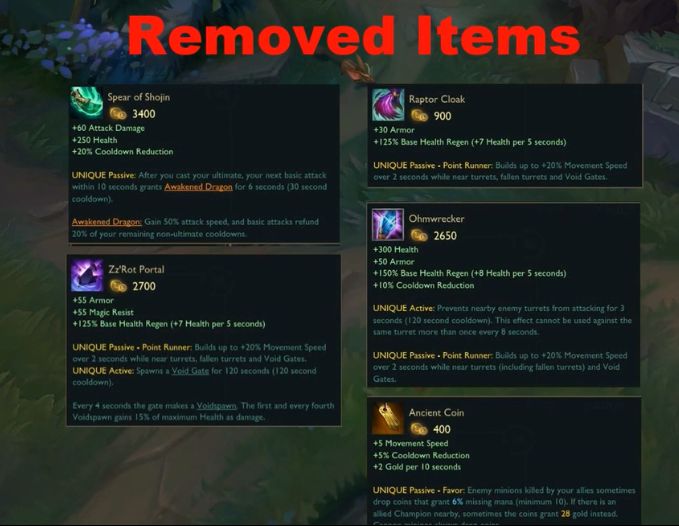 官方移除朔极之矛、猛禽斗篷、干扰水晶、上古钱币、兹若特传送门这几件装备,大家趁着S9赛季还在,能多用一下这些装备,就多用一下吧,过了S9之后,这五件装备也将成为历史。