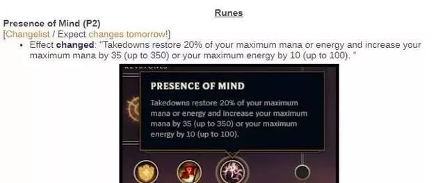 测试服又有改动啦这次是能量条英雄的受益!“气定神闲”符文大改!返还终极技能冷却时间的设定被移除,新设定是参与击杀后回复20%最大法力值或者能量值,另外参与击杀后获得35法力值或者10能量值,最多叠加10次,上限不超过350法力值和100能量值。