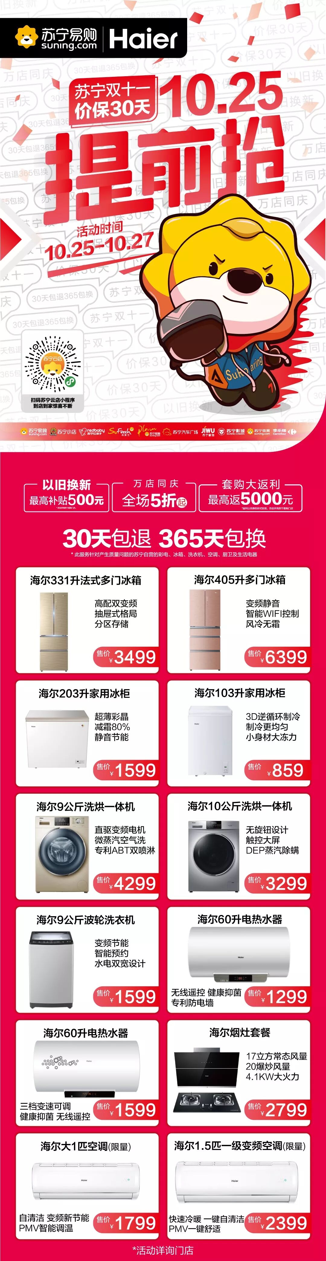 在10月25日-10月27日,前往苏宁易购门店,参与海口苏宁11.11提前抢活动,就能享受超多爆款电器冰点价。
