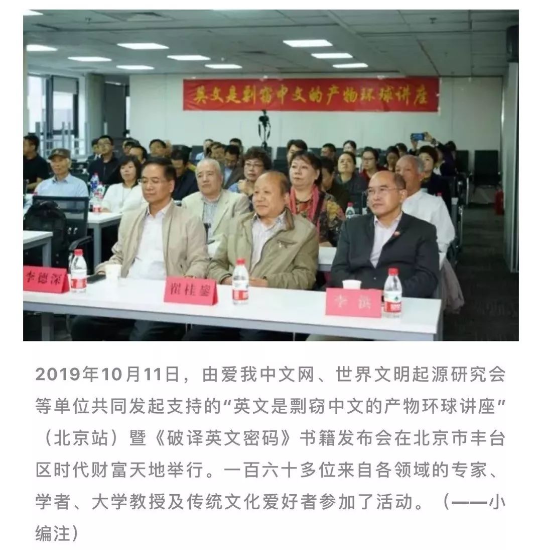 一群世界级协会的老专家老学者,云集北京,发起了一个“英文是剽窃中文的产物环球讲座”。