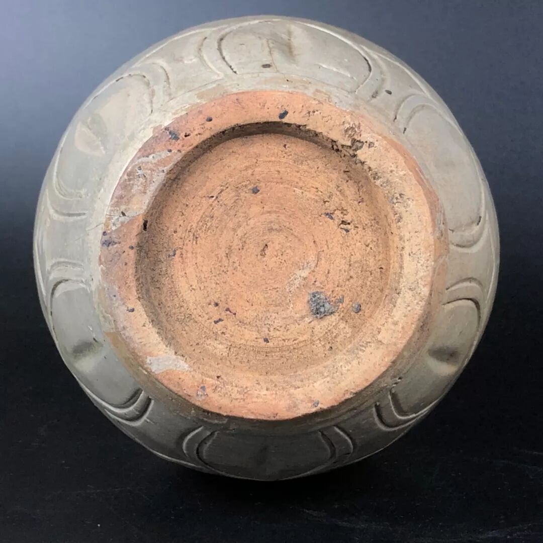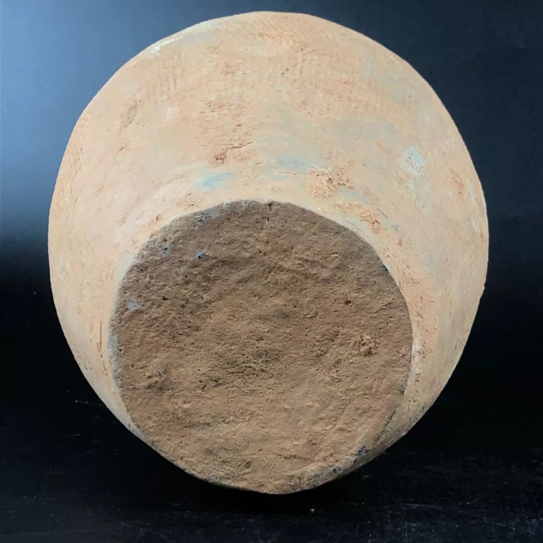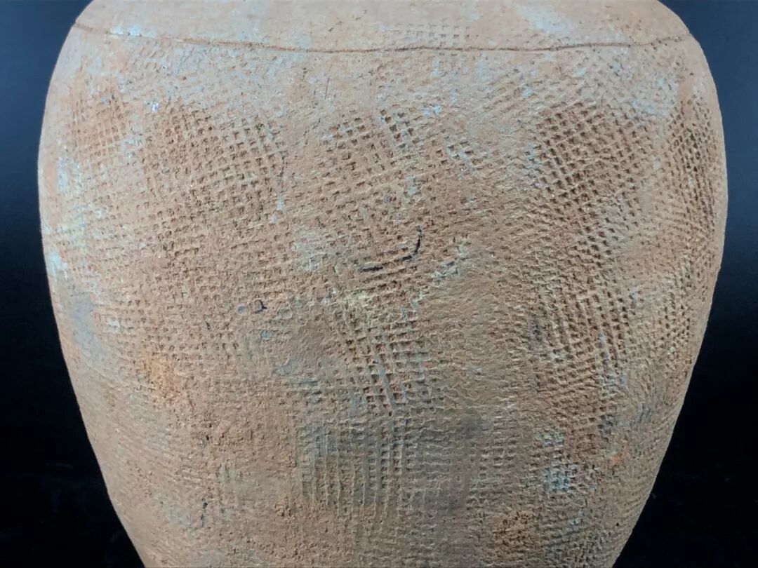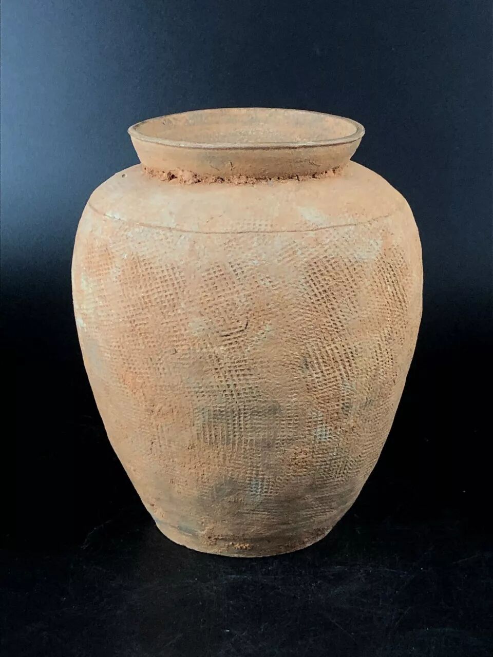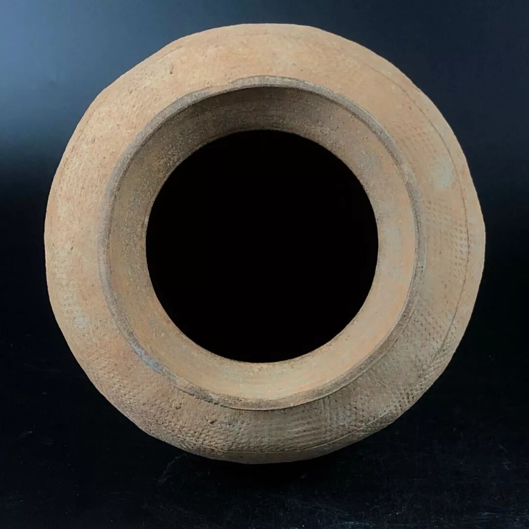 描述:器灰陶材质,造型敞口,肩部饱满腹部渐收,底部平足。器物外壁拍印麻布纹作为装饰,肩部划出一圈旋纹。该器保留原始状态,自然开门。