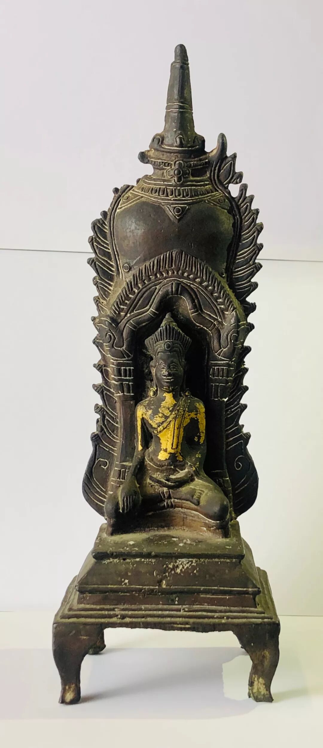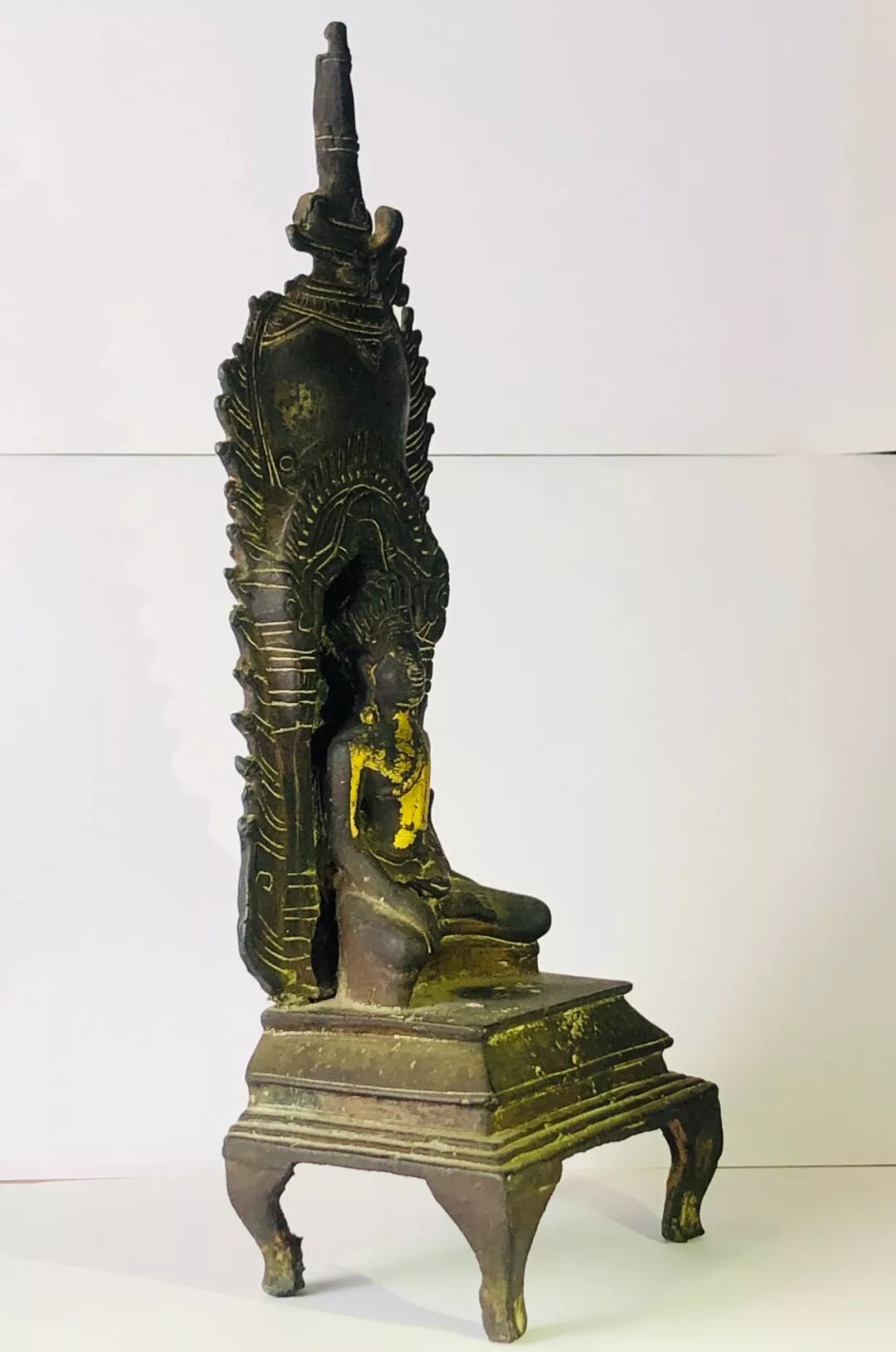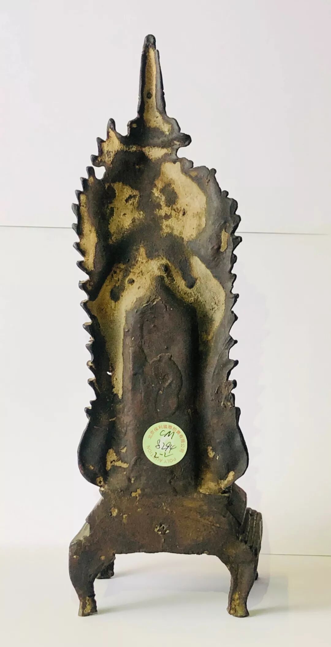 描述:此尊佛像,表现震撼,为突出佛的至高无上,佛下置四足三层底座,背后宝塔式背光及火焰纹装饰象征佛法的光辉。佛结跏趺坐,双手施印,其饱满耳垂垂坠至肩部。该器为北京保利购得,流传有序。