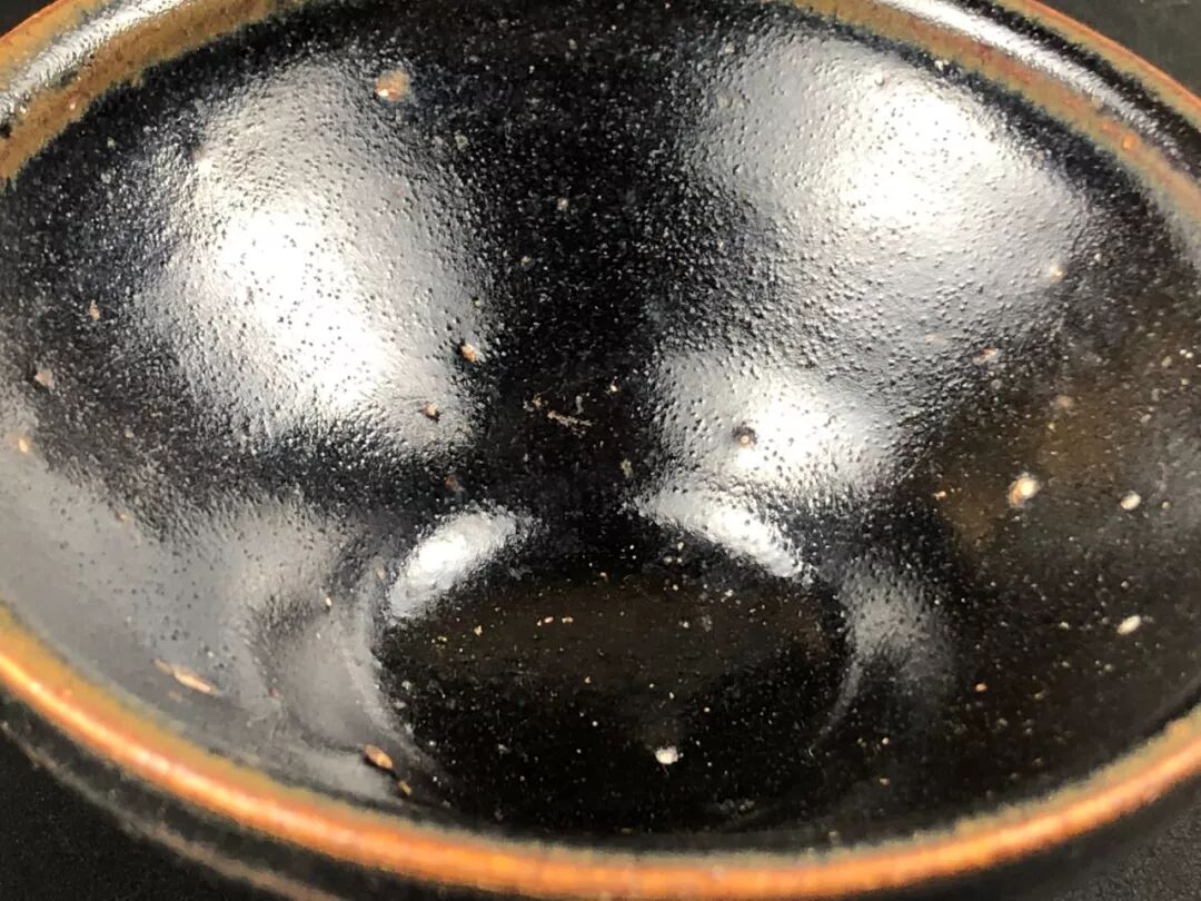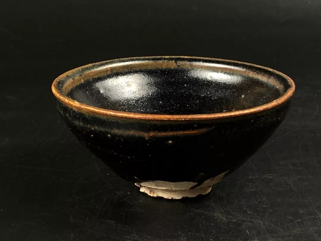 描述:福建小盏,其造型唇口束颈斜直腹台阶式浅圈足,造型工整,修坯干脆利落,所施黑釉温润内蕴,口沿内外釉薄处呈酱色,品相完美,仍具有使用价值。
