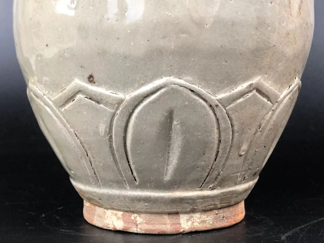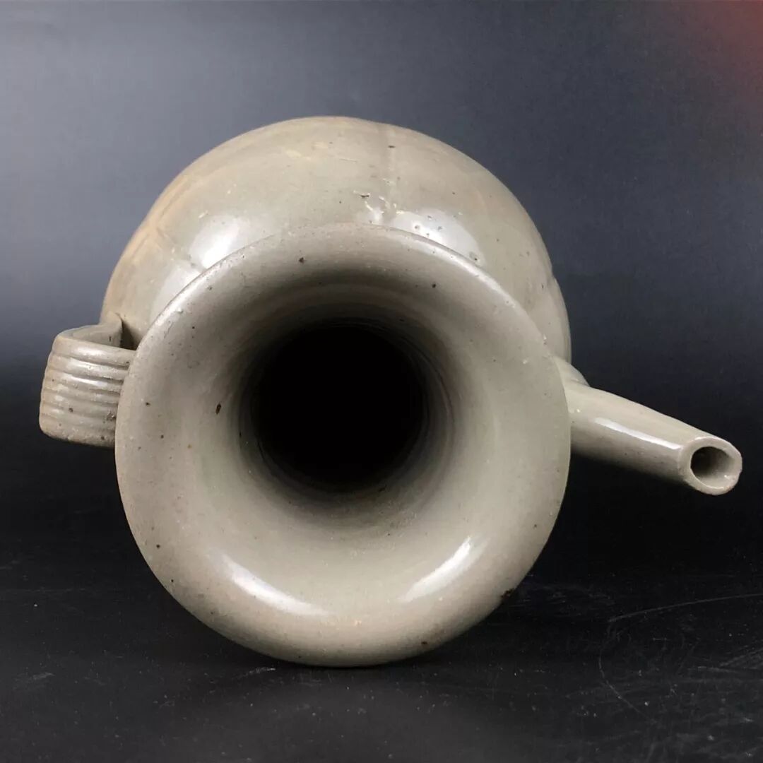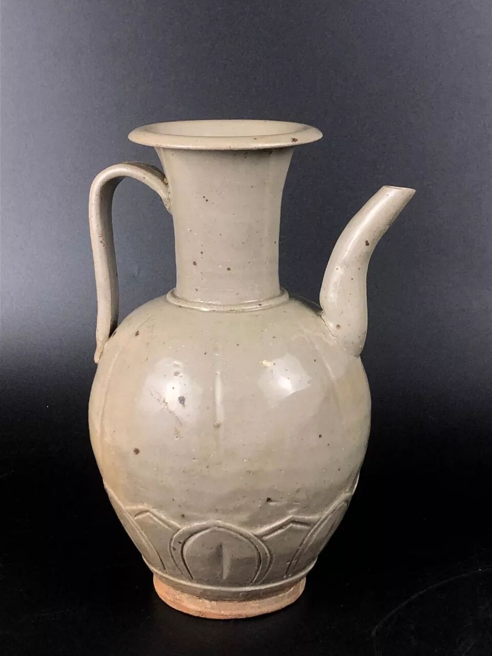 描述:该器为越窑精品执壶,其造型高庄,撇口长颈,丰满圈足,肩部对称置长曲流及条状手柄。上腹部为瓜棱造型,下腹部剔划出双层莲瓣纹饰,腹部网上釉面保存较好,其装饰手法多样,为同类执壶中少见。