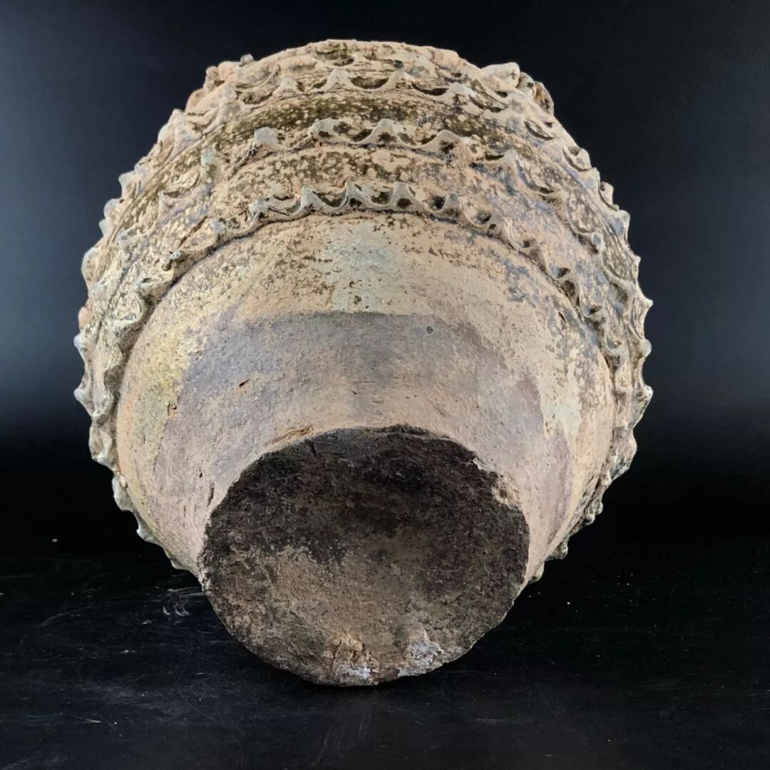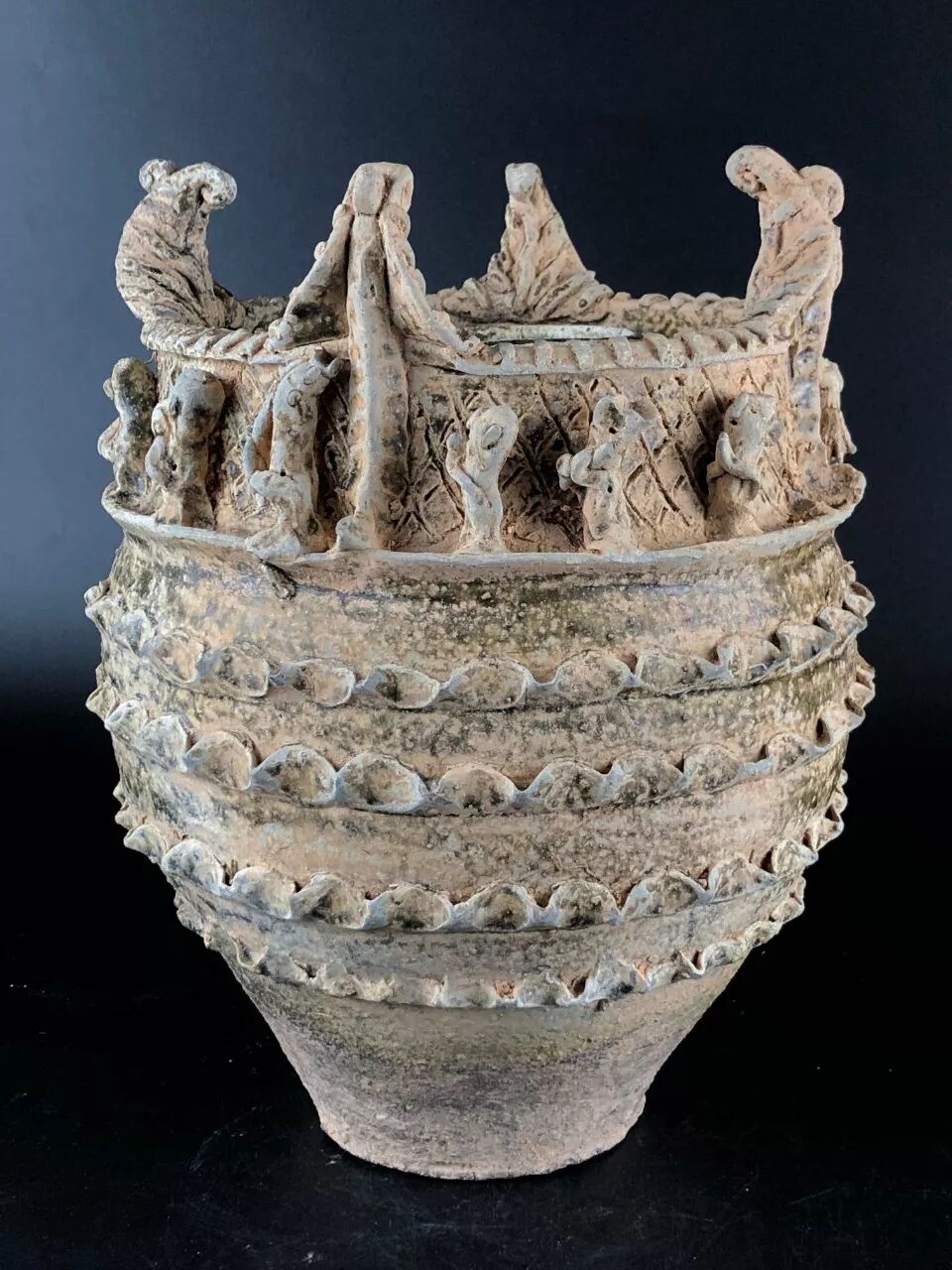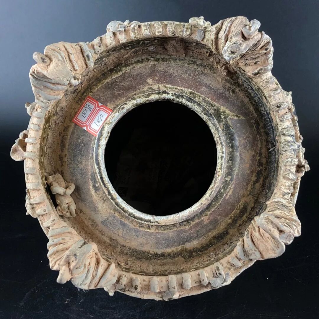 描述:器口部为泡菜坛式双层口沿,外沿高于内沿,并贴塑房檐式四角,四角间隙有瓦片式装饰。外壁纹饰繁缛,可分为上下两组纹饰,上腹部贴塑一周共计15个立体人物,人物各持乐器,表情夸张。下组纹饰共四周裙带纹装饰,如滔滔江水。整个外壁施有一层青绿釉水,显斑驳状态。