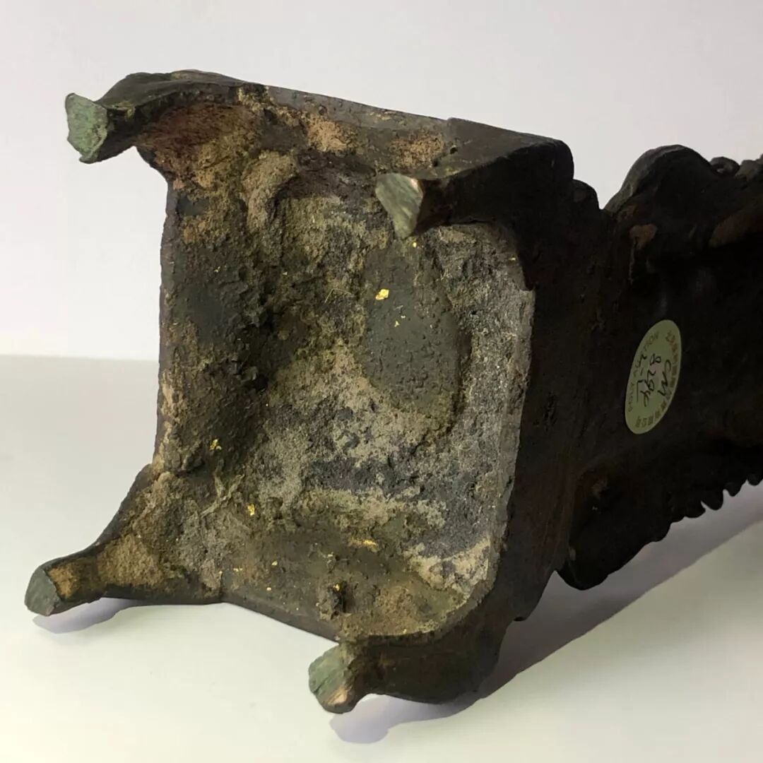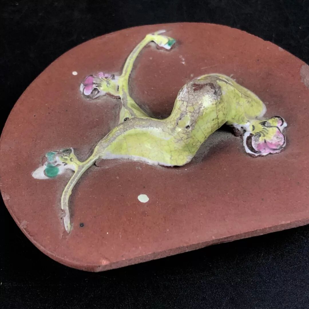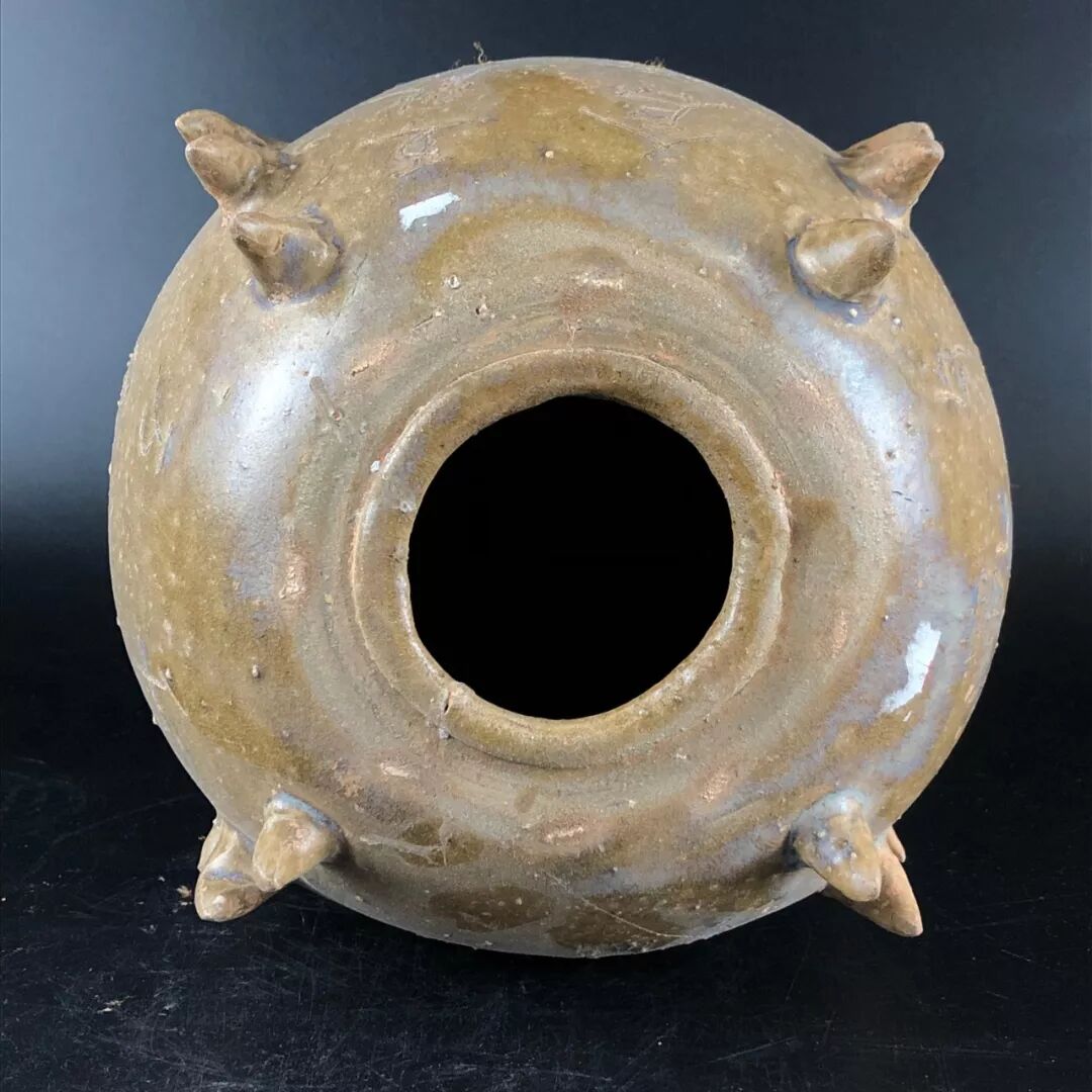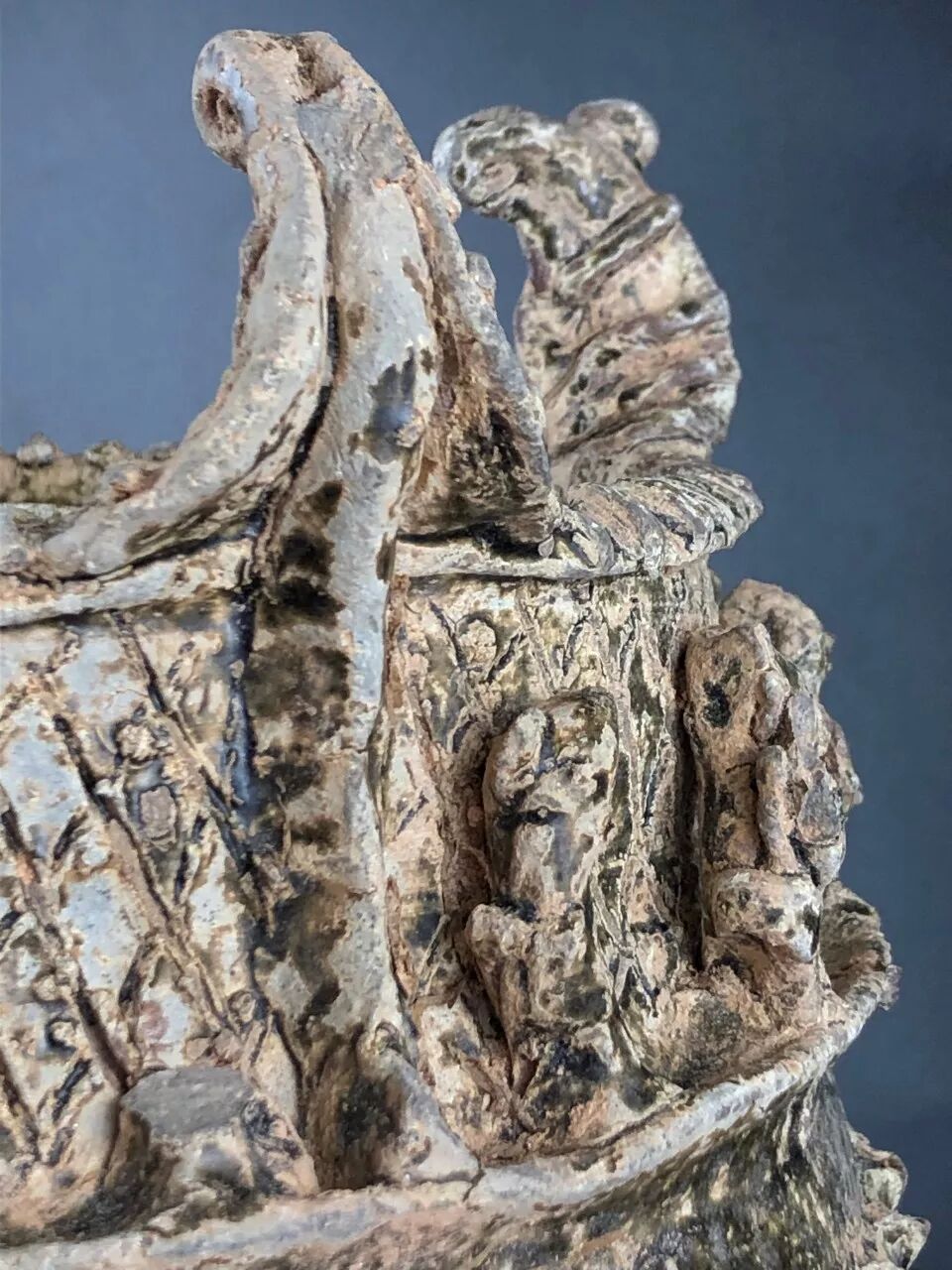 描述:器口部为泡菜坛式双层口沿,外沿高于内沿,并贴塑房檐式四角,四角间隙有瓦片式装饰。外壁纹饰繁缛,可分为上下两组纹饰,上腹部贴塑一周共计15个立体人物,人物各持乐器,表情夸张。下组纹饰共四周裙带纹装饰,如滔滔江水。整个外壁施有一层青绿釉水,显斑驳状态。
