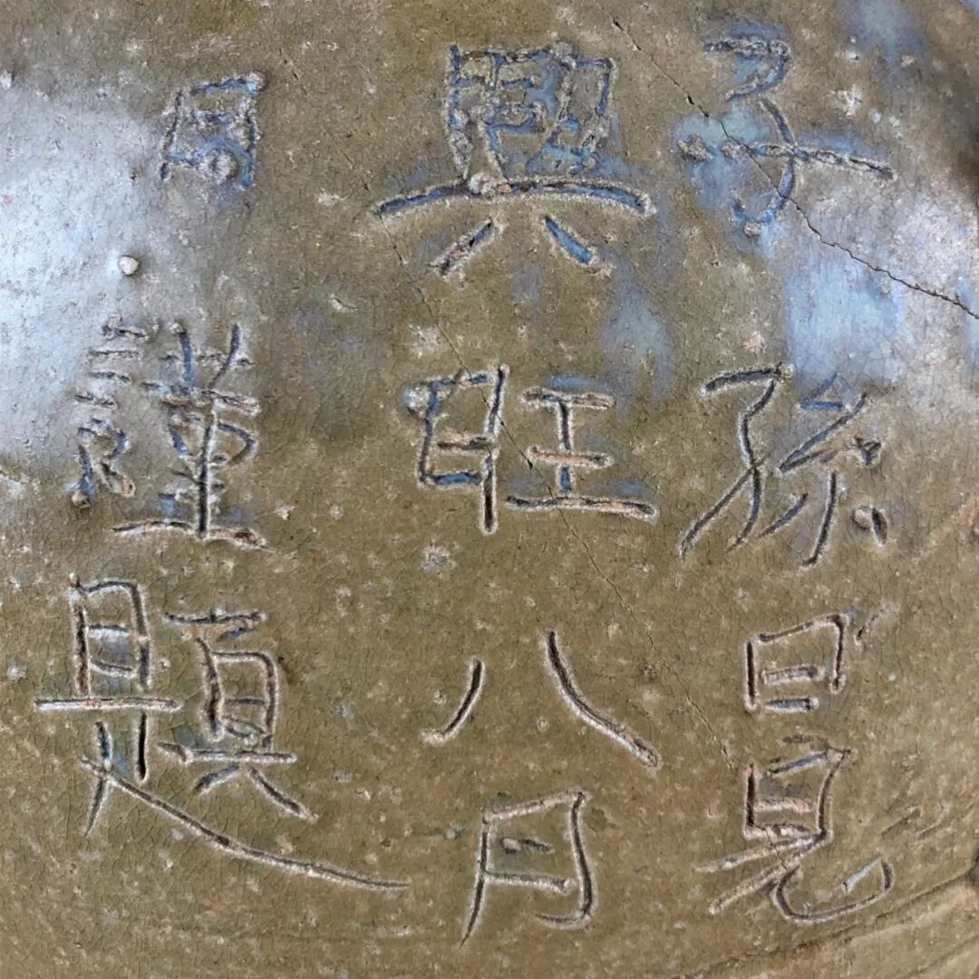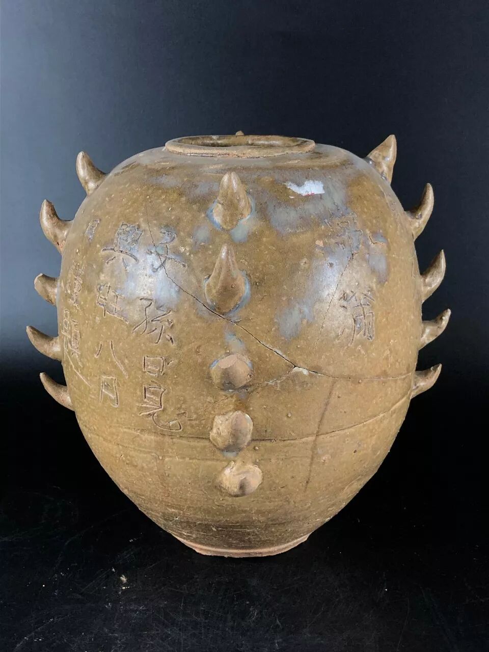 描述:谷仓唇口,腹部饱满大气。器身施青黄色釉水。腹部堆塑四组共20个角,每组之间刻划有文字“千秋万岁”、“五谷仓库年年常满”、“子孙日见兴旺,八月日谨题”。