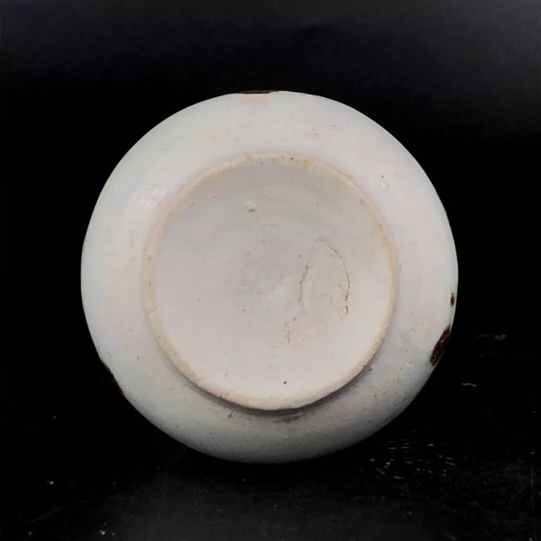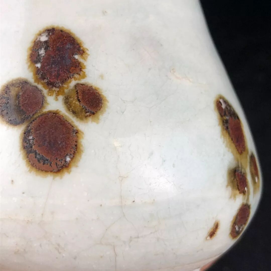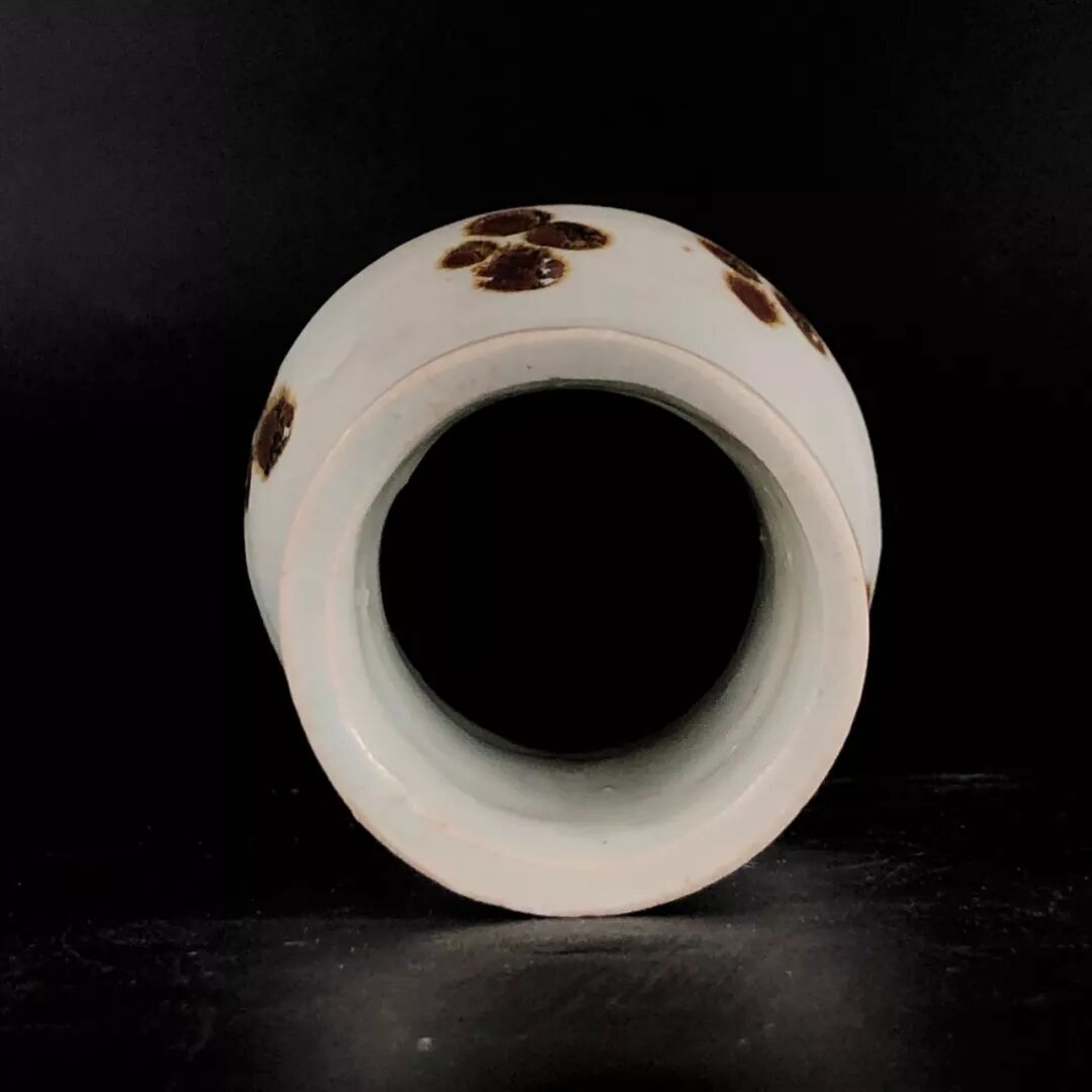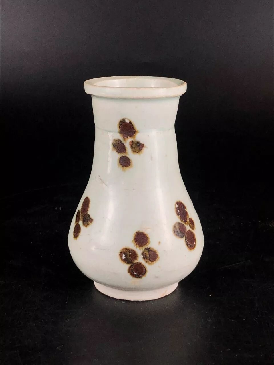 描述:瓶方唇长颈垂腹卧足,形如悬胆。瓶除底足外,内外满饰青白釉水,颈腹部点饰九组朵花纹褐彩。湖田窑以青白釉为主,点彩工艺为特殊品种,较为少见。