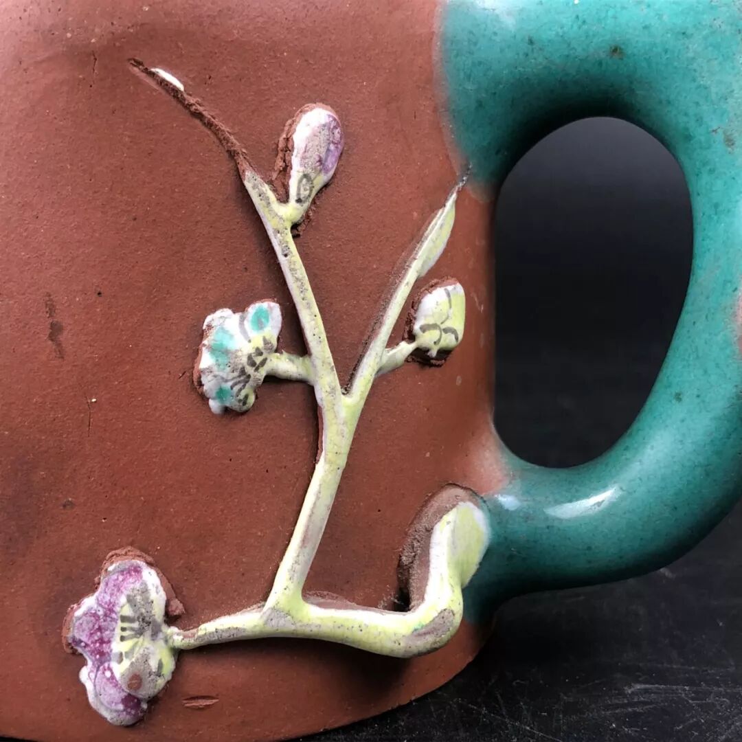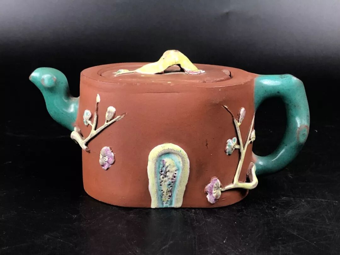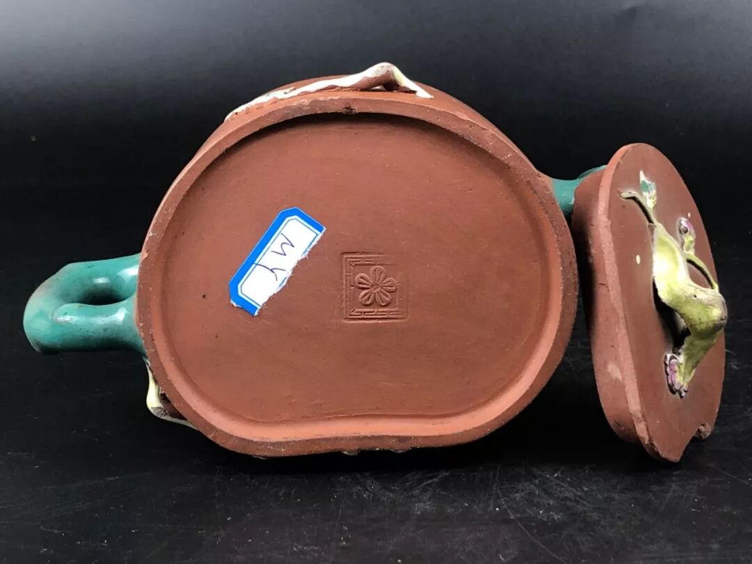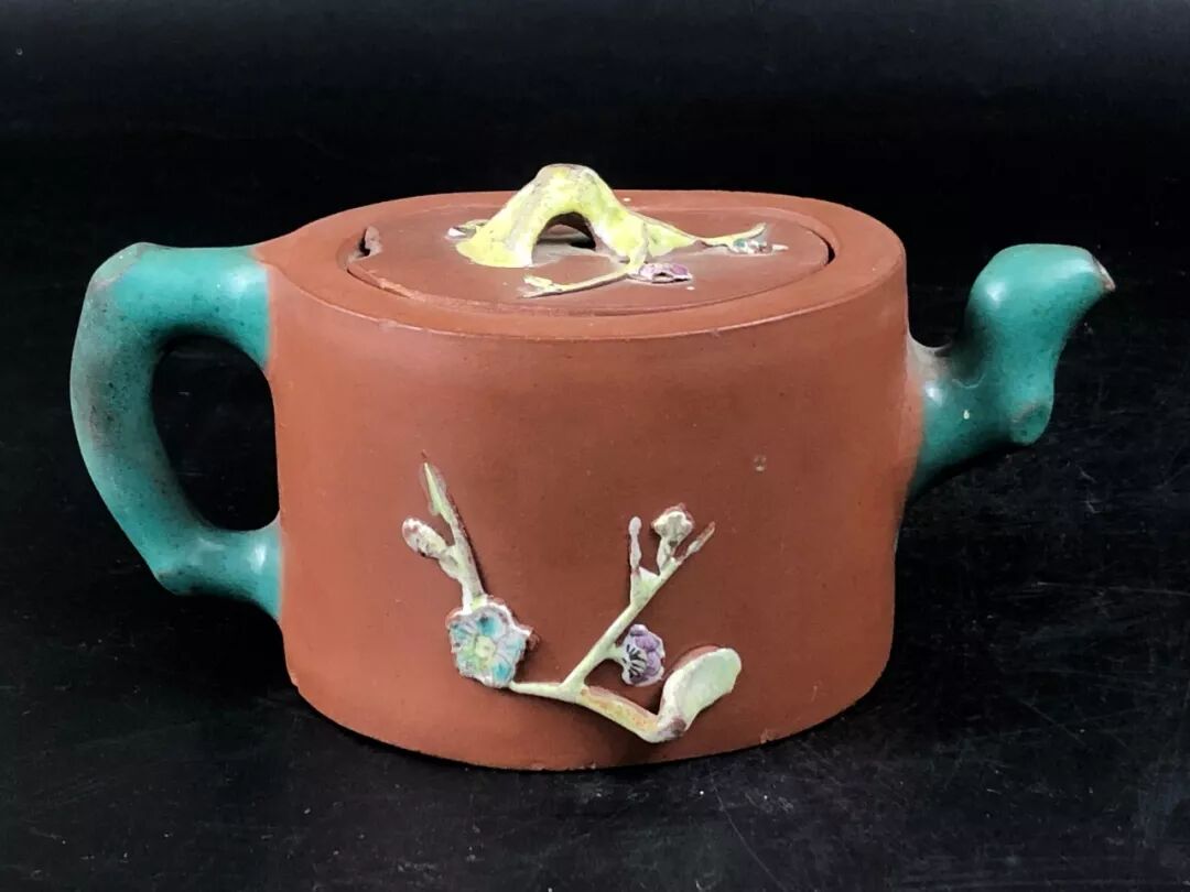 描述:茶壶紫砂胎质,剖面呈树根造型,上下两面平切,盖面堆塑折枝梅花,壶两侧置树枝形壶流及把手,表面施绿釉。腹部堆塑三组折枝梅花纹饰。外底印方款朵花纹。为典型民国紫砂茶壶。