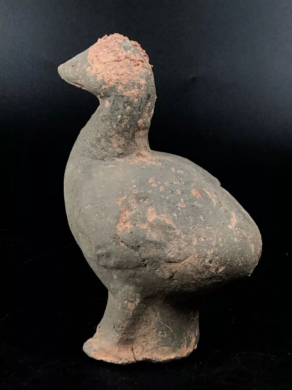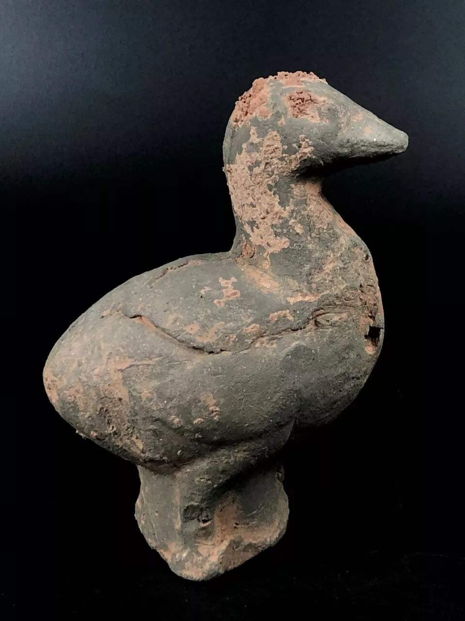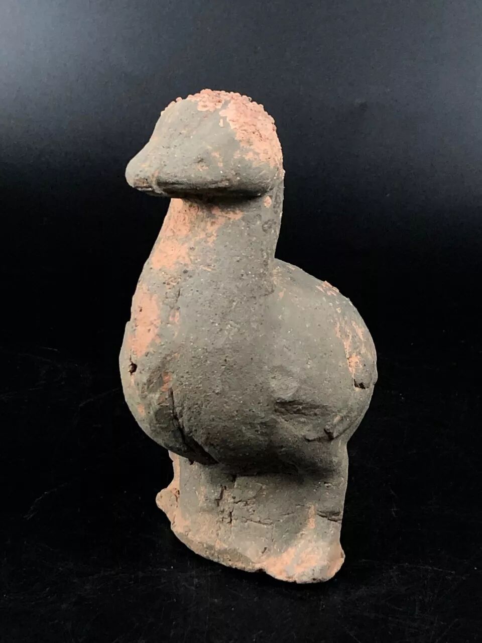 描述:鸭为泥质灰陶,为左右两处合模而成,内部中空。鸭首高昂,平视前方,双腿站立。看似随意捏成,但却捕捉住了鸭的警觉性表现出来,生动传神。