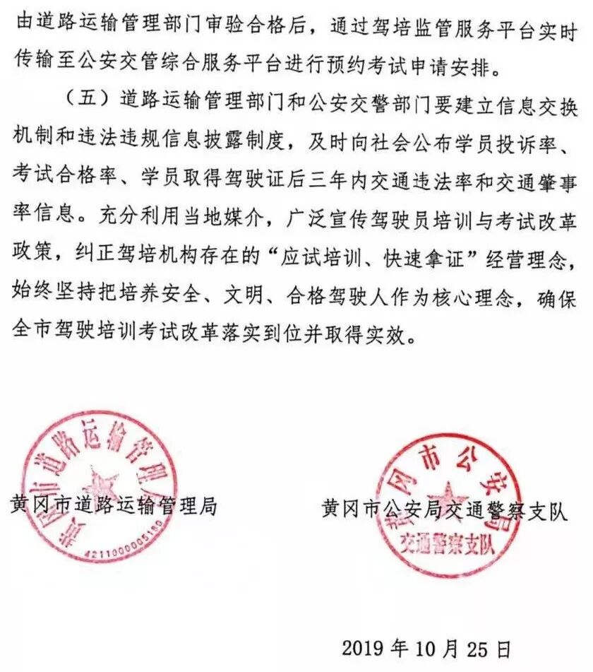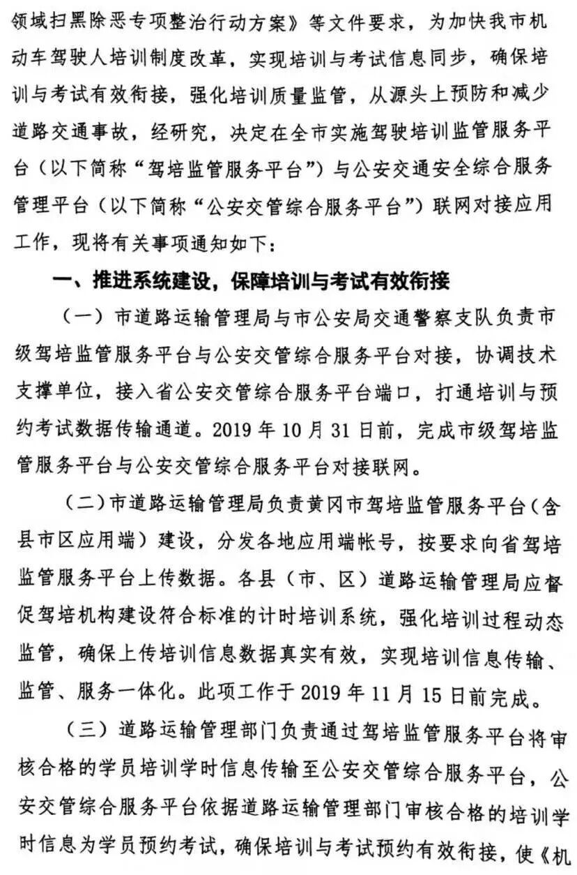 10月25日,黄冈市道路运输管理局、黄冈市公安局交通警察支队:宣布11月15日 前完成学时对接工作,12月1日起全面实行。