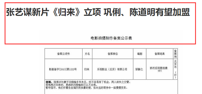 2013年由张艺谋指导,陈道明巩俐张慧雯闫妮主演的电影《归来》立项决定开拍。