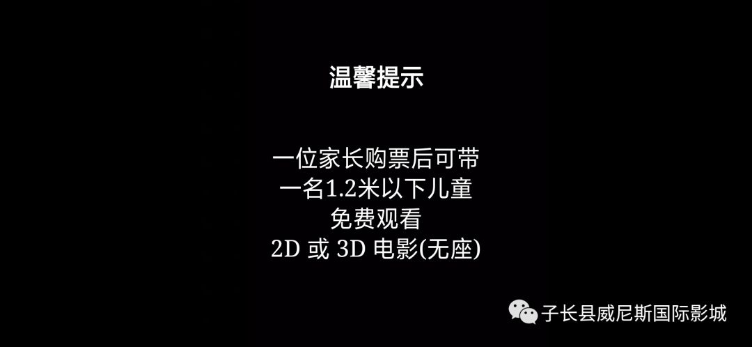 温馨提示:影城1.2以下儿童免费观影,无座位,免费3D儿童眼镜观影需有成人陪同,且每位仅能免费带1名观影儿童