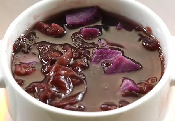 有的人煮银耳煮很长时间也没有煮出胶质,银耳块比较大的话怎么熬出胶质呢?可以在炖锅里面炖煮半个小时,或者更长时间,这样的话银耳炖煮非常浓稠,紫薯也煮得非常软糯,在里面加一些红糖搅拌一下就可以喝了。另外呢,可以把这些食材放在豆浆机里,和红豆一块打成米糊。秋天气候非常干燥,女人多喝这道养生汤,美容养颜,皮肤滋润,而且也不会贫血,大家喜欢吗?