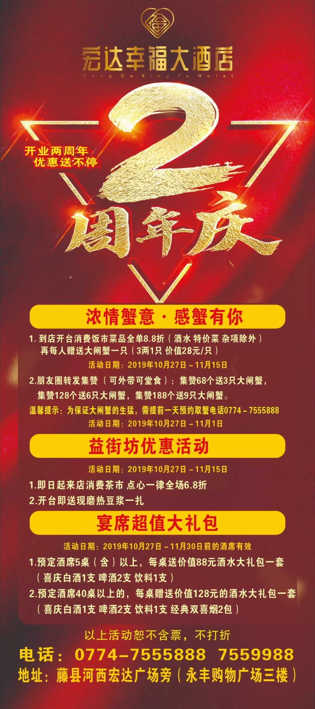 幸福大酒店在食品监督局及中成伟业食品安全餐饮管理公司的指导下,升级成为4.0无菌4D厨房暨酒店开业两周年店庆 回馈新老客户,即日起早茶点心一律全场6.8折(再送豆浆一壶)饭市全场8.8折(再送每人2.5两大闸蟹1只)酒席更有超值大礼包放送,更多惊喜活动请到店内了解。