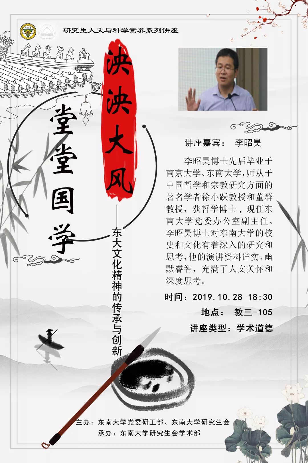 李昭昊博士,先后毕业于南京大学、东南大学,师从于中国哲学和宗教研究方面的著名学者徐小跃教授和董群教授,获哲学博士。现任东南大学党委办公室副主任。李昭昊博士对东南大学的校史和文化有着深入的研究和思考,他的演讲资料详实、幽默睿智,充满了人文关怀和深度思考。