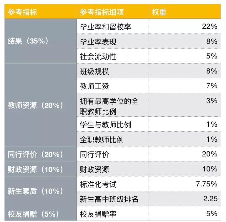 包含学生毕业率、社会流动性、教师资源、新生质量……连校友捐赠率都占5%的比重,简直关心到你在学校里生活的方方面面??
