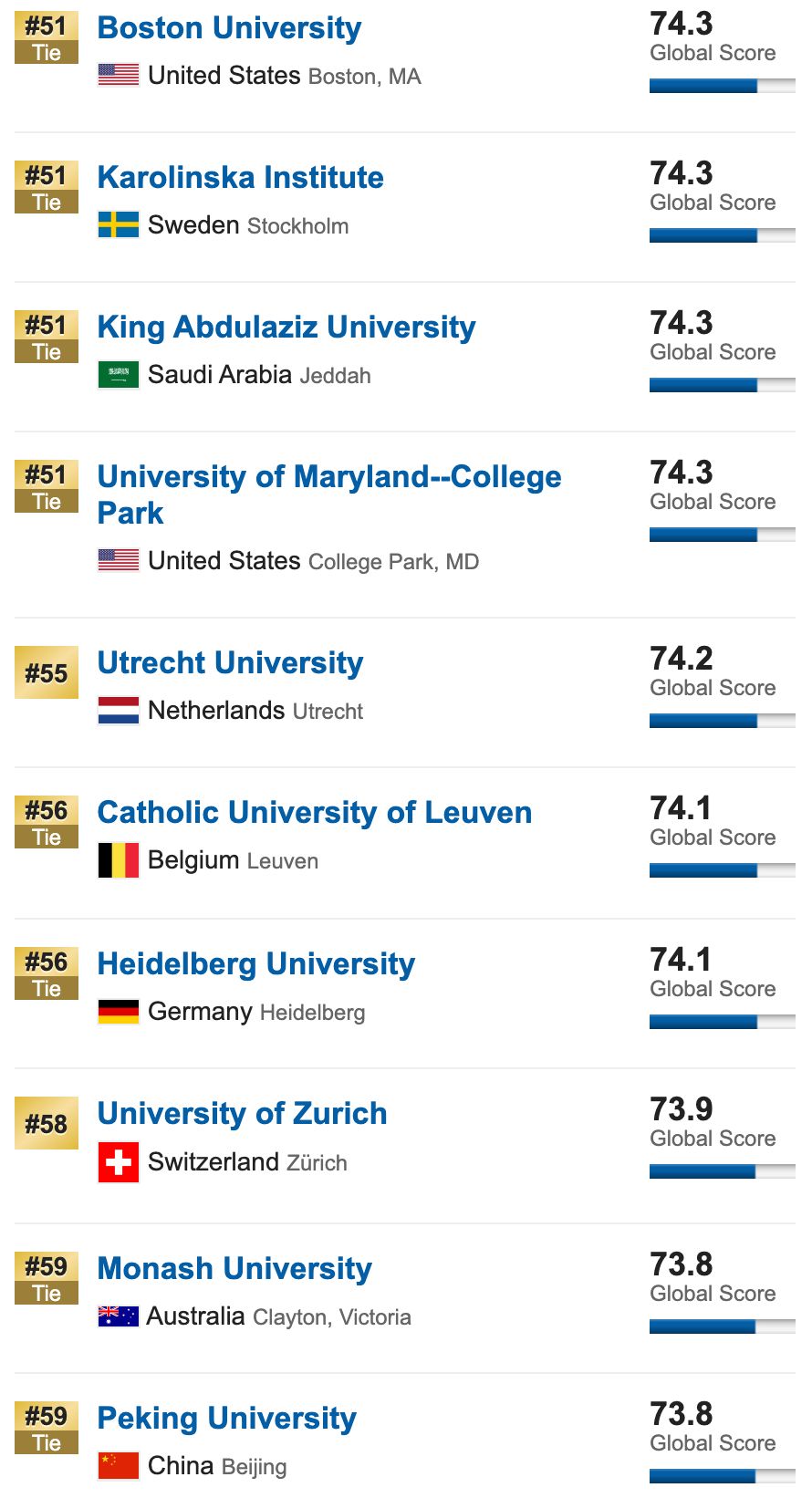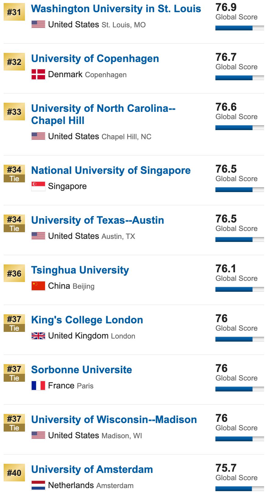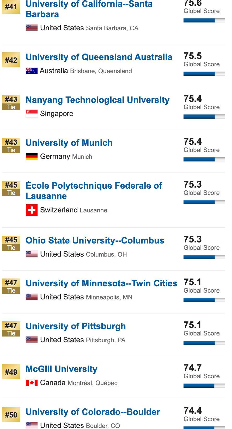 因为U.S.News实在太偏心了,世界百强榜单TOP10中除了牛剑外都是美国大学,其他榜单都名列前茅的苏黎世联邦理工学院和UCL,在U.S.News中就靠后很多。