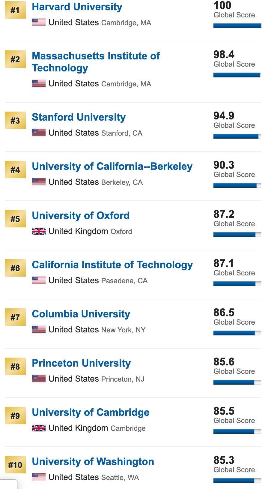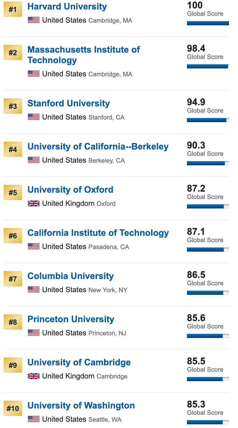 2020 U.S. News 世界大学排行榜Top10有这些(总榜请见文末)?