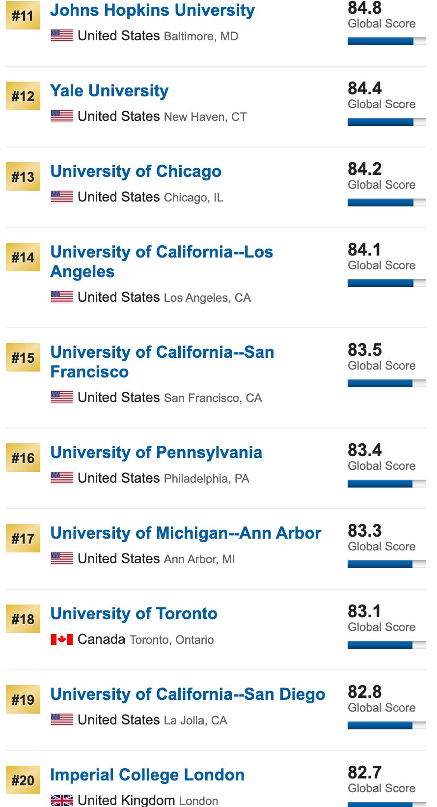 在世界榜单中,加州大学洛杉矶分校和加州大学旧金山分校竟然和耶鲁、芝加哥等齐名,排名高于藤校宾夕法尼亚大学、康奈尔大学?(另外也有人懵逼:加州大学旧金山分校是什么鬼?都没听说过就全球TOP20了!)
