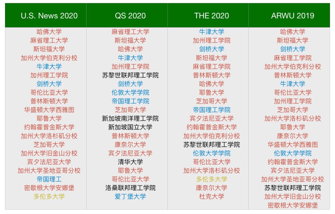 以下为四大榜单TOP20世界大学排名(红色为美国大学,蓝色为英国大学)??