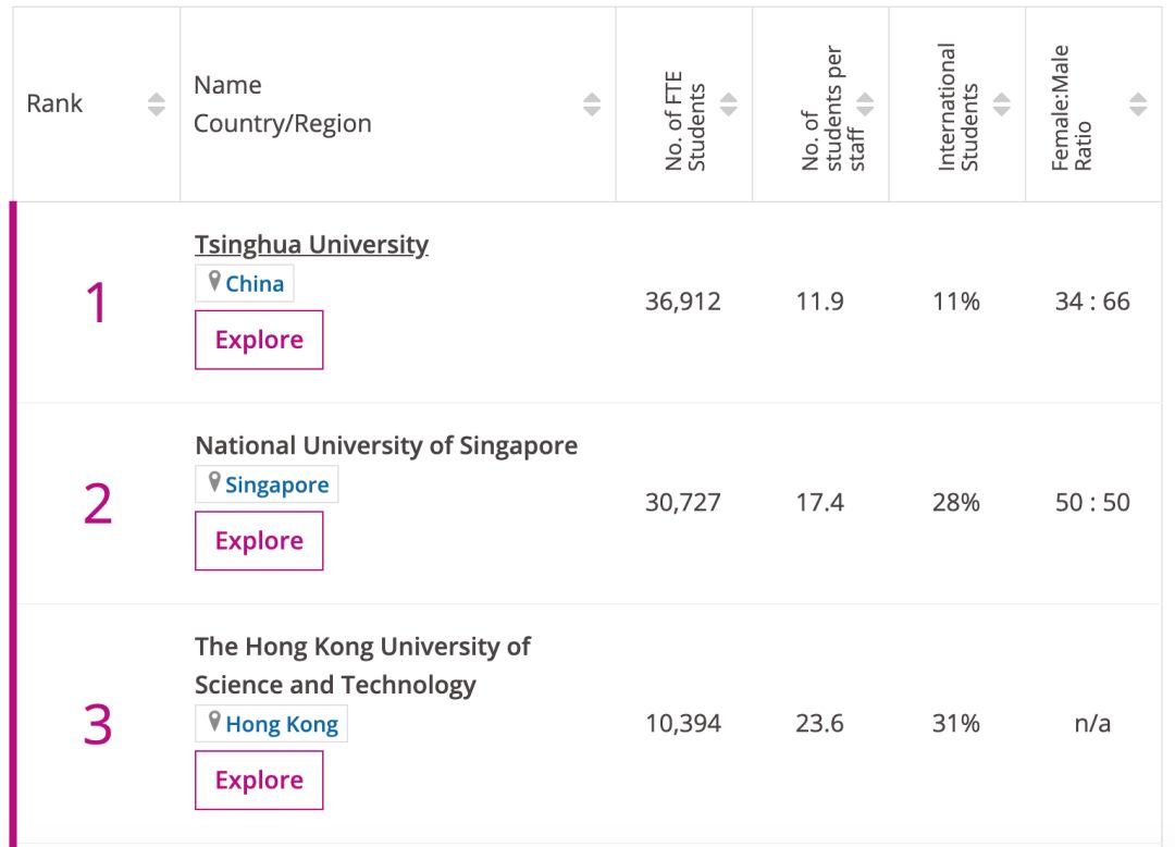 比如下面是THE的亚洲区排名,前三名是清华、新加坡国立和香港科技大学?