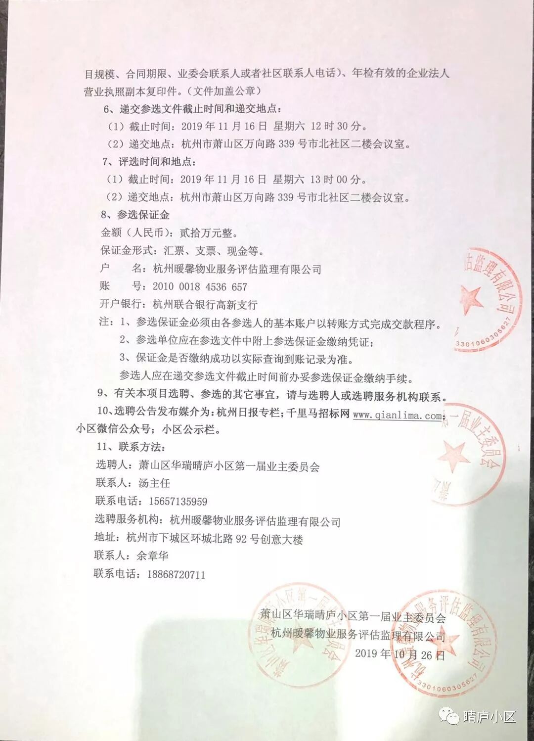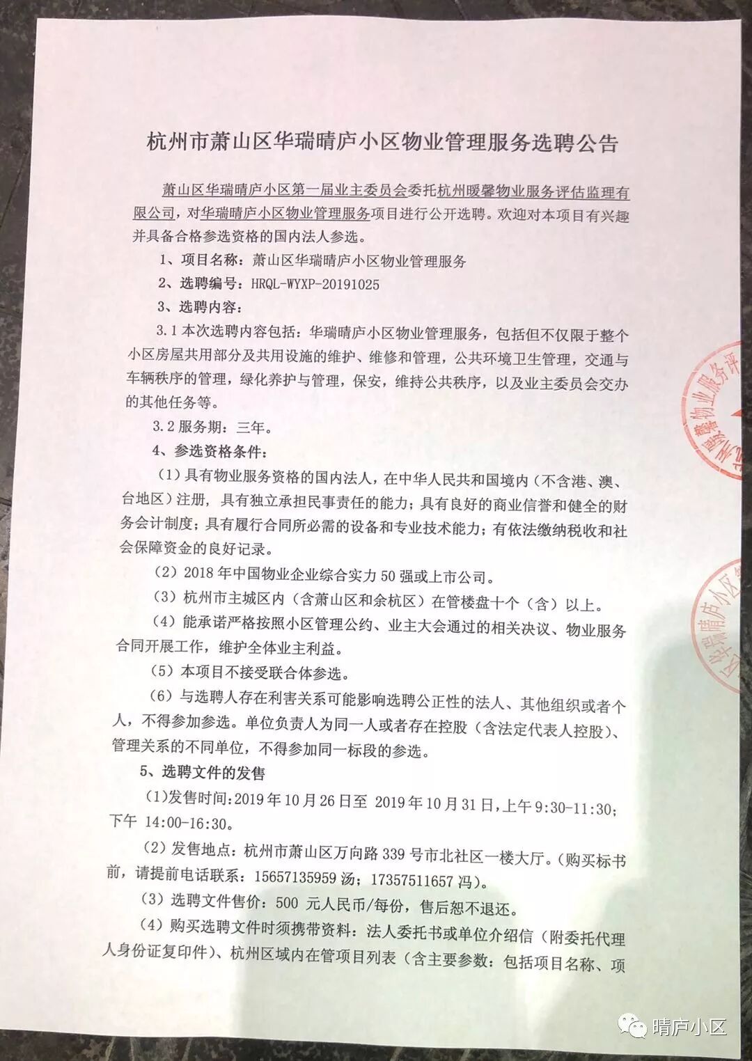 10、选聘公告发布媒介为:杭州日报专栏;千里马招标网www.qianlima.com;小区微信公众号;小区公示栏。