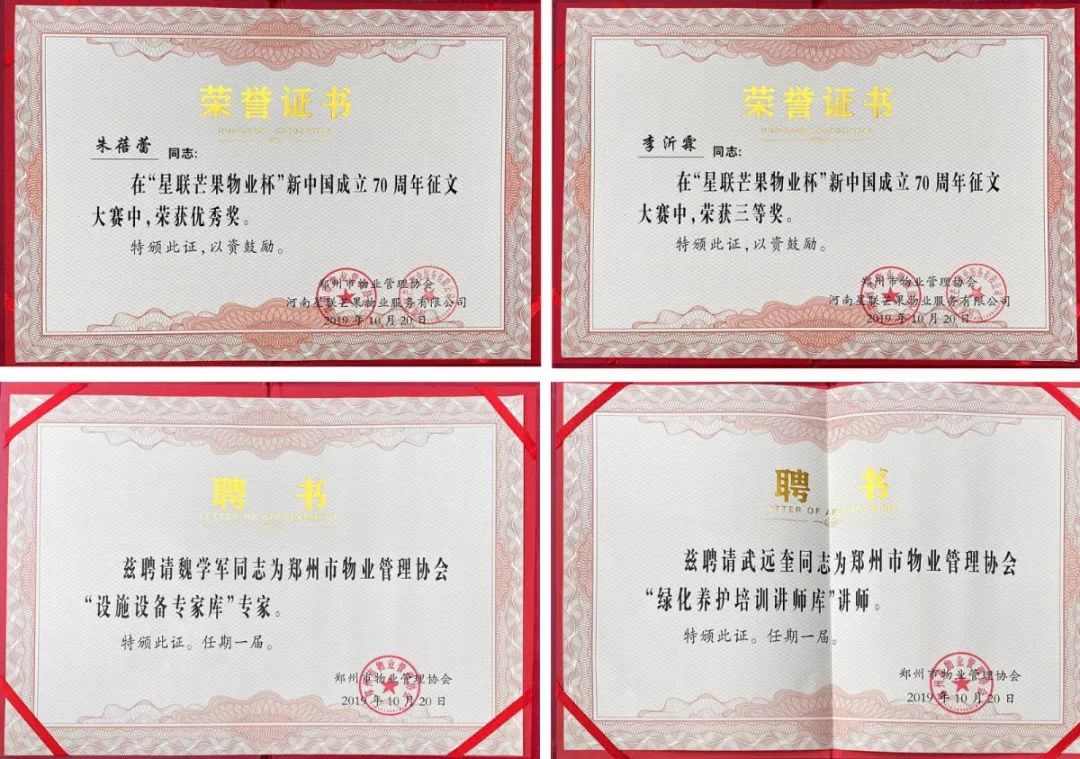 同时,永威物业模块经理魏学军及武远奎分别被郑州市物业管理协会聘为“设施设备专家库”专家、“绿化养护培训讲师库”讲师。