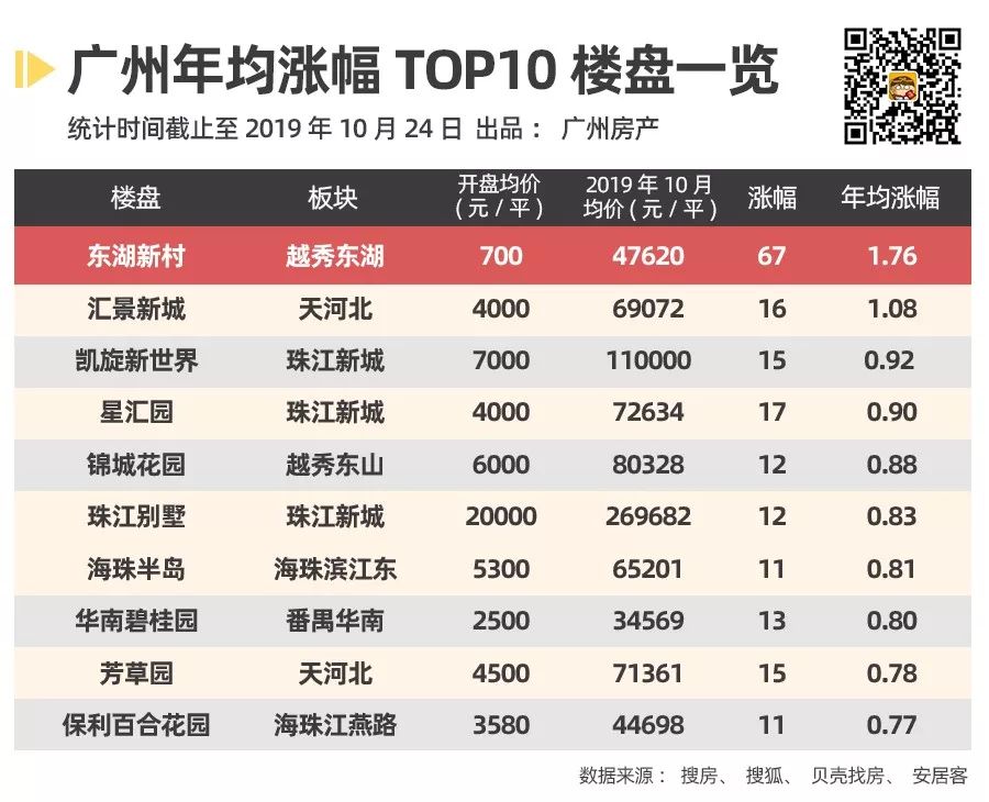 不难看到,在广州,涨幅超过11倍的楼盘中,又以汇景新城和凯旋新世界的表现尤为亮眼,前者15年飙升16倍,后者16年大涨15倍,年均涨幅高居前三。