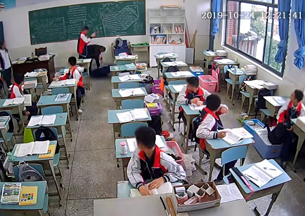 据网传时长1分47秒监控视频显示,10月24日12时21分左右,一名男性老师从后门进入教室,准备将手中的雨伞撑开放在地上,另有一名男生紧随其后,男生双手紧握疑似砖头物件,从背后击打男性老师头部9次,致该名老师倒地不起。